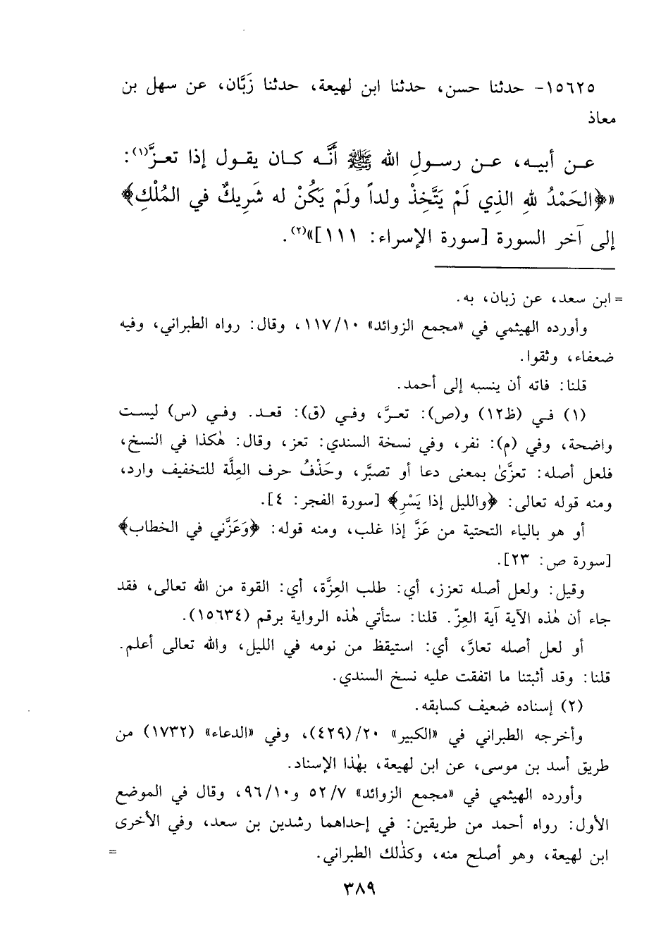 ١٥٦٢٥ - حَدَّثَنَا حَسَنٌ، حَدَّثَنَا ابْنُ لَهِيعَةَ، حَدَّثَنَا زَبَّانُ، عَنْ سَهْلِ بْنِ مُعَاذٍ، عَنْ أَبِيهِ، عَنْ رَسُولِ اللهِ صَلَّى اللهُ عَلَيْهِ وَسَلَّمَ أَنَّهُ كَانَ يَقُولُ إِذَا تَعَزَّ: (١) " {الْحَمْدُ لِلَّهِ الَّذِي لَمْ يَتَّخِذْ وَلَدًا وَلَمْ يَكُنْ لَهُ شَرِيكٌ فِي الْمُلْكِ} [الإسراء: ١١١] إِلَى آخِرِ السُّورَةِ " (٢)
