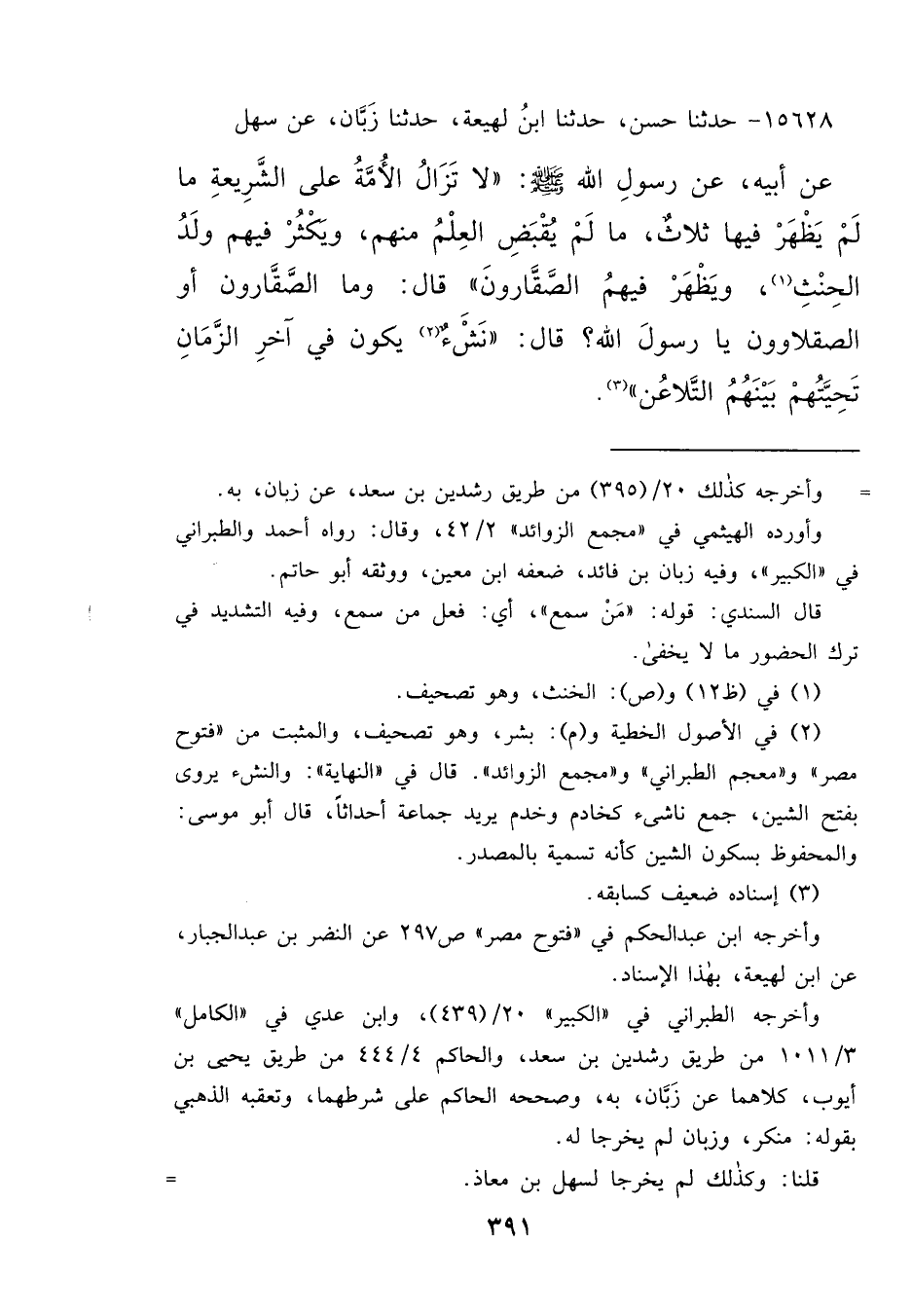 ١٥٦٢٨ - حَدَّثَنَا حَسَنٌ، حَدَّثَنَا ابْنُ لَهِيعَةَ، حَدَّثَنَا زَبَّانُ، عَنْ سَهْلٍ، عَنْ أَبِيهِ، عَنْ رَسُولِ اللهِ صَلَّى اللهُ عَلَيْهِ وَسَلَّمَ: " لَا تَزَالُ الْأُمَّةُ عَلَى الشَّرِيعَةِ مَا لَمْ يَظْهَرْ فِيهَا ثَلَاثٌ: مَا لَمْ يُقْبَضِ الْعِلْمُ مِنْهُمْ، وَيَكْثُرْ فِيهِمْ وَلَدُ الْحِنْثِ (١) ، وَيَظْهَرْ فِيهِمُ الصَّقَّارُونَ " قَالَ: وَمَا الصَّقَّارُونَ - أَوِ الصَّقْلَاوُونَ - يَا رَسُولَ اللهِ؟ قَالَ: " بَشَرٌ (٢) يَكُونُ فِي آخِرِ الزَّمَانِ تَحِيَّتُهُمْ بَيْنَهُمُ التَّلَاعُنُ " (٣)