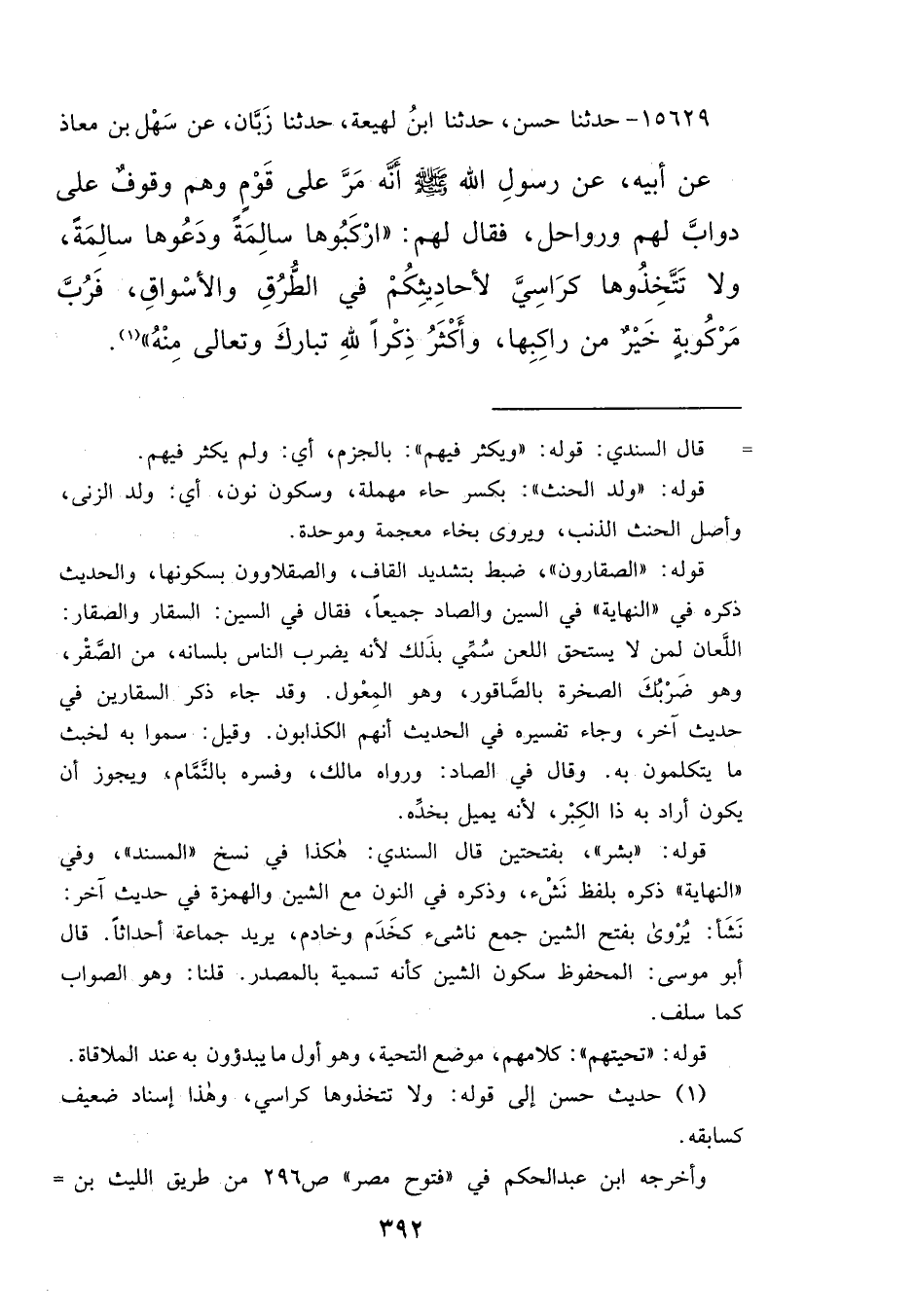١٥٦٢٩ - حَدَّثَنَا حَسَنٌ، حَدَّثَنَا ابْنُ لَهِيعَةَ، حَدَّثَنَا زَبَّانُ، عَنْ سَهْلِ بْنِ مُعَاذٍ، عَنْ أَبِيهِ، عَنْ رَسُولِ اللهِ صَلَّى اللهُ عَلَيْهِ وَسَلَّمَ أَنَّهُ مَرَّ عَلَى قَوْمٍ وَهُمْ وُقُوفٌ عَلَى دَوَابَّ لَهُمْ وَرَوَاحِلَ، فَقَالَ لَهُمْ: " ارْكَبُوهَا سَالِمَةً، وَدَعُوهَا سَالِمَةً، وَلَا تَتَّخِذُوهَا كَرَاسِيَّ لِأَحَادِيثِكُمْ فِي الطُّرُقِ، وَالْأَسْوَاقِ فَرُبَّ مَرْكُوبَةٍ خَيْرٌ مِنْ رَاكِبِهَا، وَأَكْثَرُ ذِكْرًا لِلَّهِ تَبَارَكَ وَتَعَالَى مِنْهُ " (١)