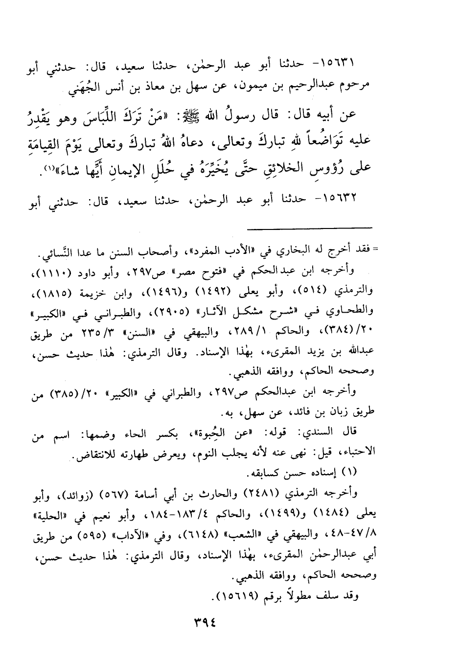 ١٥٦٣١ - حَدَّثَنَا أَبُو عَبْدِ الرَّحْمَنِ، حَدَّثَنَا سَعِيدٌ قَالَ: حَدَّثَنِي أَبُو مَرْحُومٍ عَبْدُ الرَّحِيمِ بْنِ مَيْمُونٍ، عَنْ سَهْلِ بْنِ مُعَاذِ بْنِ أَنَسٍ الْجُهَنِيِّ، عَنْ أَبِيهِ، قَالَ: قَالَ رَسُولُ اللهِ صَلَّى اللهُ عَلَيْهِ وَسَلَّمَ: " مَنْ تَرَكَ اللِّبَاسَ، وَهُوَ يَقْدِرُ عَلَيْهِ تَوَاضُعًا لِلَّهِ تَبَارَكَ وَتَعَالَى، دَعَاهُ اللهُ تَبَارَكَ وَتَعَالَى يَوْمَ الْقِيَامَةِ عَلَى رُءُوسِ الْخَلَائِقِ، حَتَّى يُخَيِّرَهُ فِي حُلَلِ الْإِيمَانِ أَيَّهَا شَاءَ " (١)
