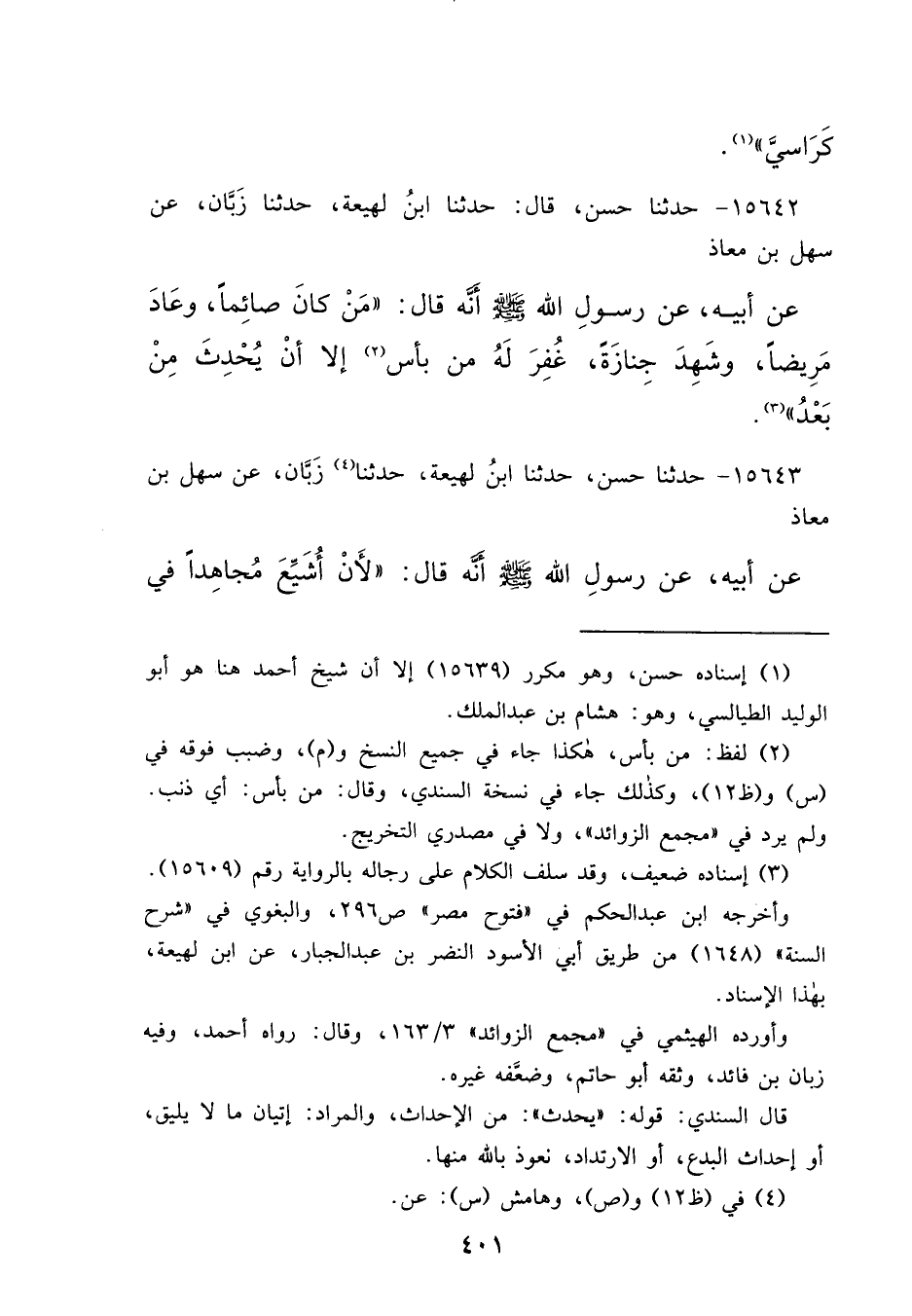 ١٥٦٤٢ - حَدَّثَنَا حَسَنٌ، قَالَ: حَدَّثَنَا ابْنُ لَهِيعَةَ، حَدَّثَنَا زَبَّانُ، عَنْ سَهْلِ بْنِ مُعَاذٍ، عَنْ أَبِيهِ، عَنْ رَسُولِ اللهِ صَلَّى اللهُ عَلَيْهِ وَسَلَّمَ أَنَّهُ قَالَ: " مَنْ كَانَ صَائِمًا، وَعَادَ مَرِيضًا، وَشَهِدَ جَنَازَةً، غُفِرَ لَهُ مِنْ بَأْسٍ (٢) ، إِلَّا أَنْ يُحْدِثَ مِنْ بَعْدُ " (٣)