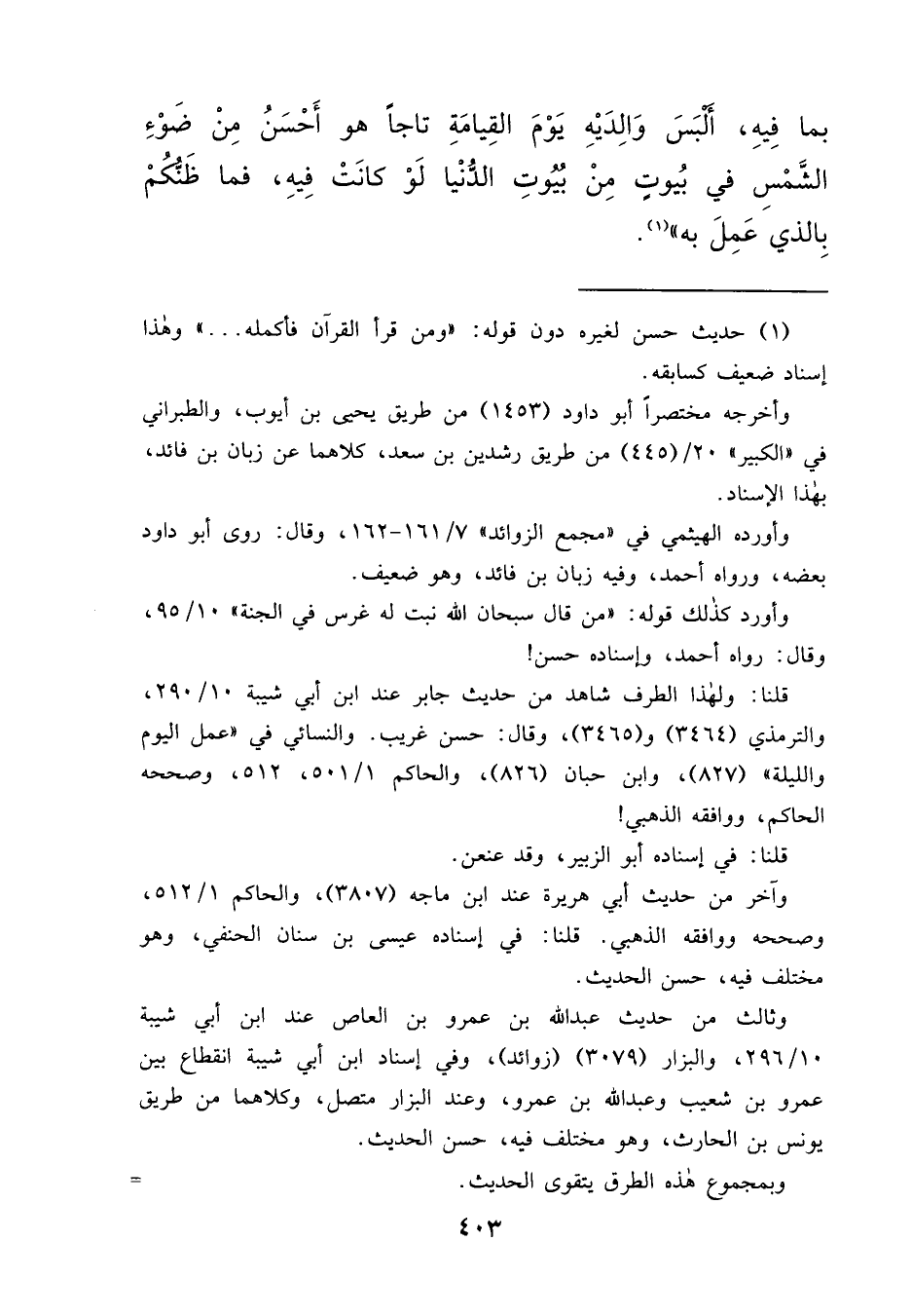 بِمَا فِيهِ، أَلْبَسَ وَالِدَيهِ يَوْمَ الْقِيَامَةِ تَاجًا هُوَ أَحْسَنُ مِنْ ضَوْءِ الشَّمْسِ فِي بُيُوتٍ مِنْ بُيُوتِ الدُّنْيَا، لَوْ كَانَتْ فِيهِ، فَمَا ظَنُّكُمْ بِالَّذِي عَمِلَ بِهِ " (١)