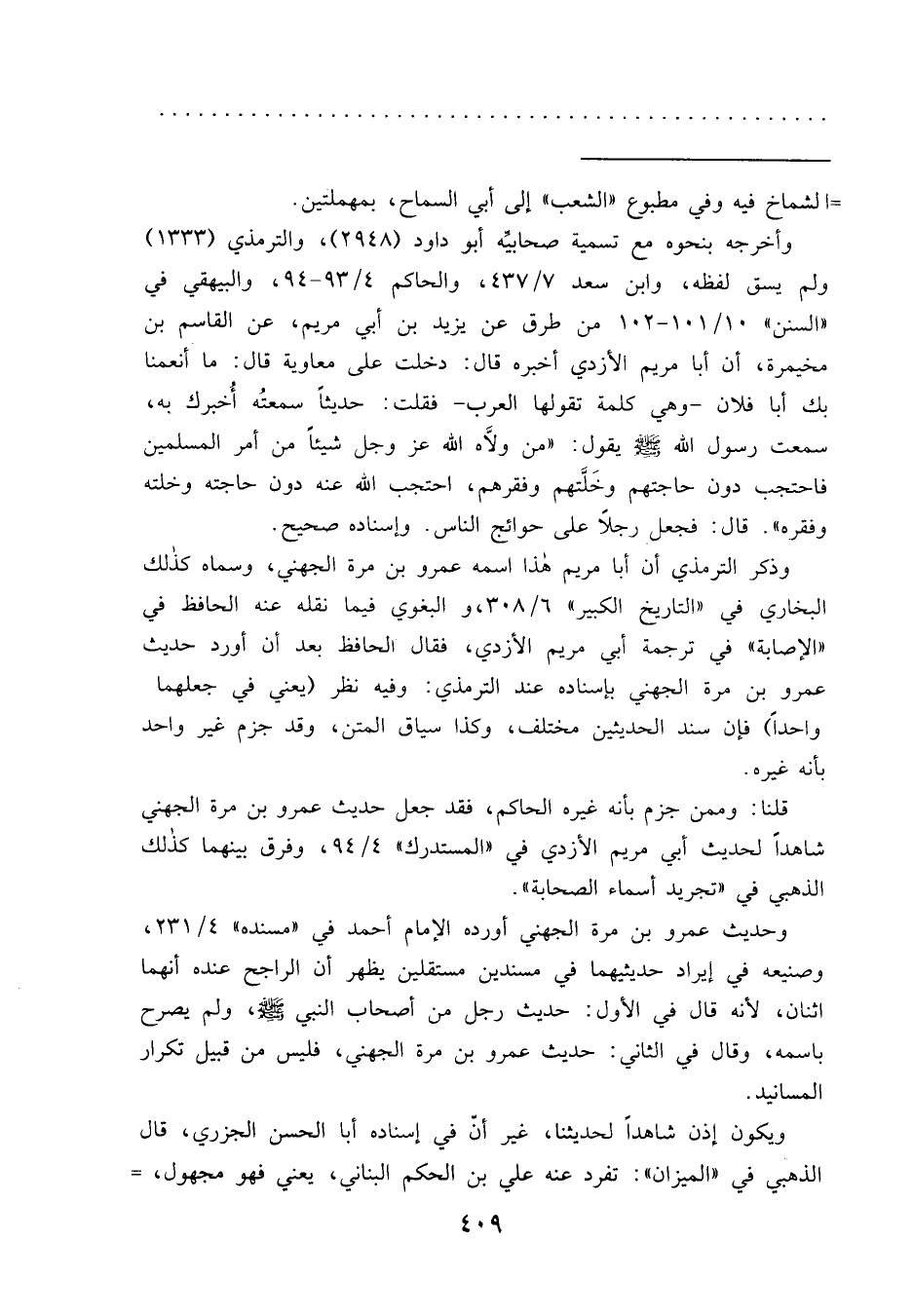 قلنا: وممن جزم بأنه غيره الحاكم، فقد جعل حديث عمرو بن مرة الجهني شاهداً لحديث أبي مريم الأزدي في "المستدرك" ٤/٩٤، وفرق بينهما كذلك الذهبي في "تجريد أسماء الصحابة".