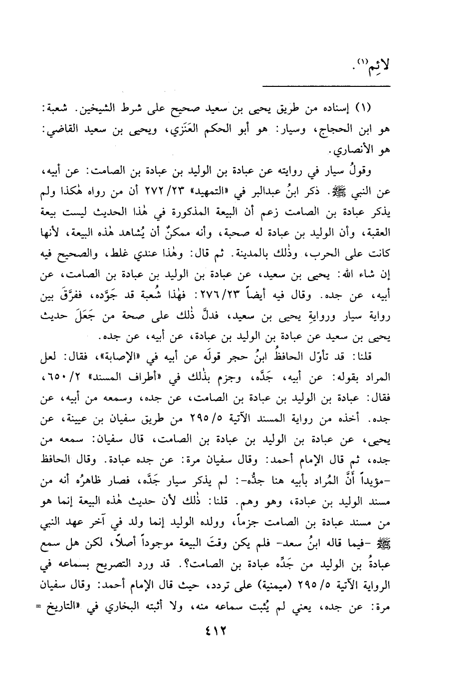 يحيى، عن عبادة بن الوليد بن عبادة بن الصامت، قال سفيان: سمعه من جده، ثم قال الإمام أحمد: وقال سفيان مرة: عن جده عبادة. وقال الحافظ - مؤيداً أن المُراد بأبيه هنا جدُّه-: لم يذكر سيار جَدَّه، فصار ظاهرُه أنه من مسند الوليد بن عبادة، وهو وهم. قلنا: ذلك لأن حديث هذه البيعة إنما هو