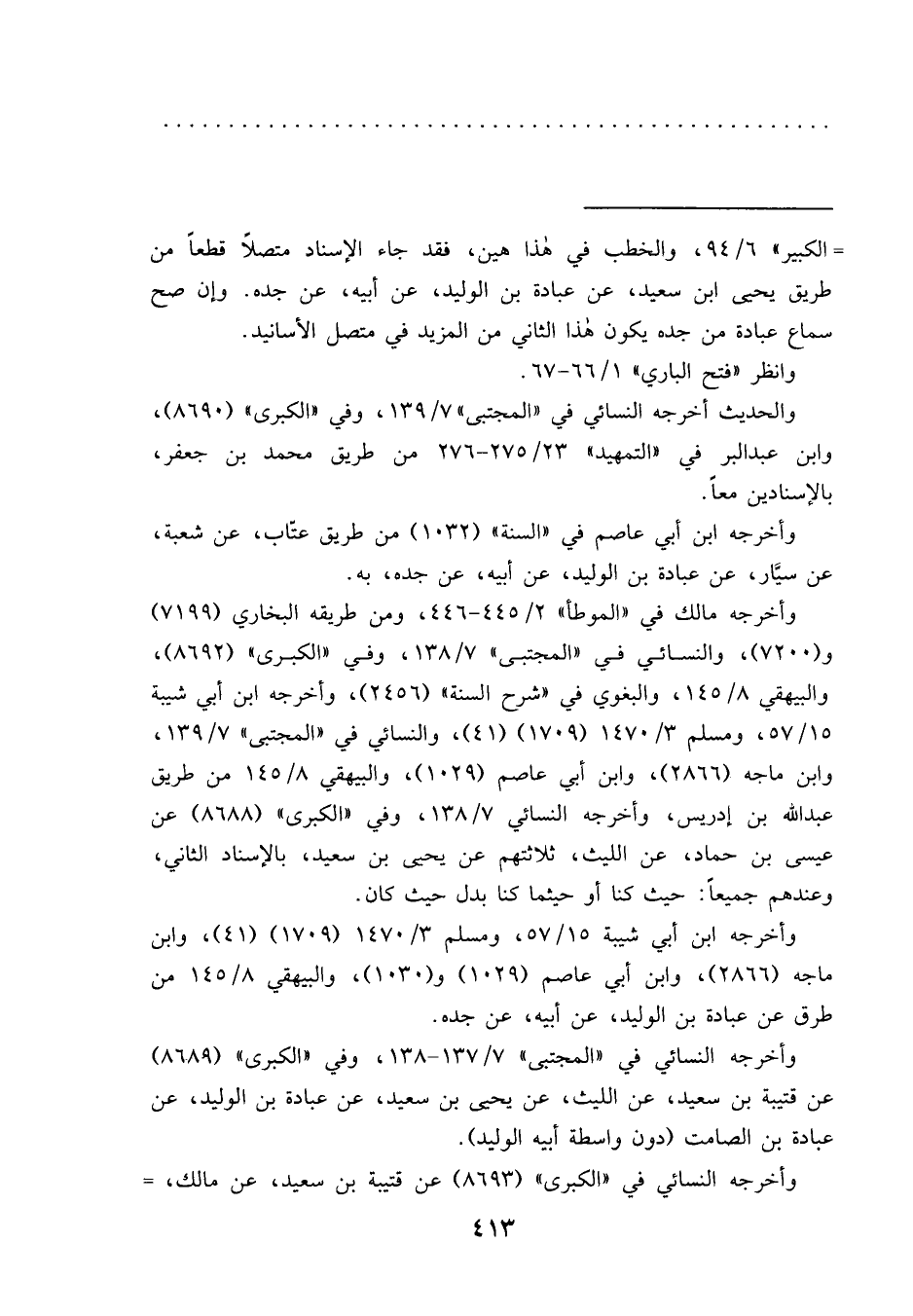 = الكبير" ٦/٩٤، والخطب في هذا هين، فقد جاء الإسناد متصلاً قطعاً من طريق يحيى ابن سعيد، عن عبادة بن الوليد، عن أبيه، عن جده. وإن صح سماع عبادة من جده يكون هذا الثاني من المزيد في متصل الأسانيد.