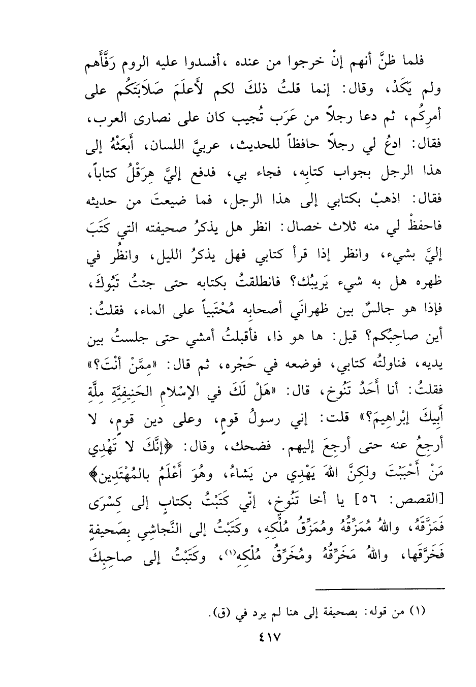فَلَمَّا ظَنَّ أَنَّهُمْ إِنْ خَرَجُوا مِنْ عِنْدِهِ، أَفْسَدُوا عَلَيْهِ الرُّومَ رَفَأَهُمْ وَلَمْ يَكَدْ، وَقَالَ: إِنَّمَا قُلْتُ ذَلِكَ لَكُمْ لِأَعْلَمَ صَلَابَتَكُمْ عَلَى أَمْرِكُمْ، ثُمَّ دَعَا رَجُلًا مِنْ عَرَبِ تُجِيبَ كَانَ عَلَى نَصَارَى الْعَرَبِ، فَقَالَ: ادْعُ لِي رَجُلًا حَافِظًا لِلْحَدِيثِ، عَرَبِيَّ اللِّسَانِ، أَبْعَثْهُ إِلَى هَذَا الرَّجُلِ بِجَوَابِ كِتَابِهِ، فَجَاءَ بِي، فَدَفَعَ إِلَيَّ هِرَقْلُ كِتَابًا، فَقَالَ: اذْهَبْ بِكِتَابِي إِلَى هَذَا الرَّجُلِ، فَمَا ضَيَّعْتُ مِنْ حَدِيثِهِ، فَاحْفَظْ لِي مِنْهُ ثَلَاثَ خِصَالٍ: انْظُرْ هَلْ يَذْكُرُ صَحِيفَتَهُ الَّتِي كَتَبَ إِلَيَّ بِشَيْءٍ، وَانْظُرْ إِذَا قَرَأَ كِتَابِي فَهَلْ يَذْكُرُ اللَّيْلَ، وَانْظُرْ فِي ظَهْرِهِ هَلْ بِهِ شَيْءٌ يَرِيبُكَ؟ فَانْطَلَقْتُ بِكِتَابِهِ حَتَّى جِئْتُ تَبُوكَ، فَإِذَا هُوَ جَالِسٌ بَيْنَ ظَهْرَانَيْ أَصْحَابِهِ مُحْتَبِيًا عَلَى الْمَاءِ، فَقُلْتُ: أَيْنَ صَاحِبُكُمْ؟ قِيلَ: هَا هُوَ ذَا، فَأَقْبَلْتُ أَمْشِي حَتَّى جَلَسْتُ بَيْنَ يَدَيْهِ، فَنَاوَلْتُهُ كِتَابِي، فَوَضَعَهُ فِي حَجْرِهِ، ثُمَّ قَالَ: " مِمَّنْ أَنْتَ؟ " فَقُلْتُ: أَنَا أَحَدُ تَنُوخَ، قَالَ: " هَلْ لَكَ فِي الْإِسْلَامِ الْحَنِيفِيَّةِ مِلَّةِ أَبِيكَ إِبْرَاهِيمَ؟ " قُلْتُ: إِنِّي رَسُولُ قَوْمٍ، وَعَلَى دِينِ قَوْمٍ لَا أَرْجِعُ عَنْهُ حَتَّى أَرْجِعَ إِلَيْهِمْ، فَضَحِكَ وَقَالَ: {إِنَّكَ لَا تَهْدِي مَنْ أَحْبَبْتَ، وَلَكِنَّ اللهَ يَهْدِي مَنْ يَشَاءُ وَهُوَ أَعْلَمُ بِالْمُهْتَدِينَ} " يَا أَخَا تَنُوخَ، إِنِّي كَتَبْتُ بِكِتَابٍ إِلَى كِسْرَى فَمَزَّقَهُ، وَاللهُ مُمَزِّقُهُ، وَمُمَزِّقٌ مُلْكَهُ، وَكَتَبْتُ إِلَى النَّجَاشِيِّ بِصَحِيفَةٍ، فَخَرَقَهَا وَاللهُ مُخْرِقُهُ، وَمُخْرِقٌ مُلْكَهُ، (١) وَكَتَبْتُ إِلَى صَاحِبِكَ