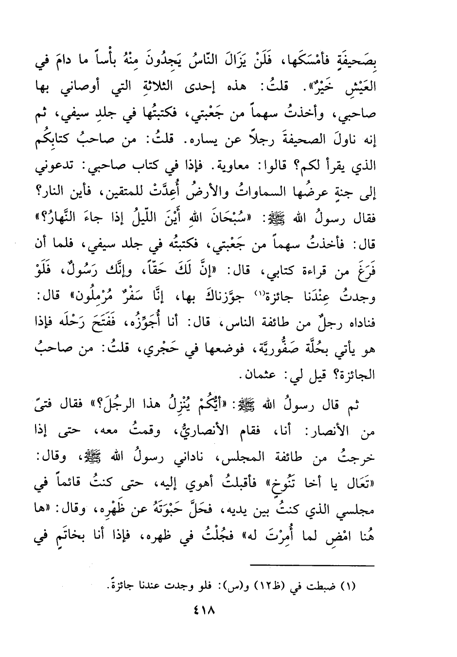 بِصَحِيفَةٍ، فَأَمْسَكَهَا فَلَنْ يَزَالَ النَّاسُ يَجِدُونَ مِنْهُ بَأْسًا مَا دَامَ فِي الْعَيْشِ خَيْرٌ "، قُلْتُ: هَذِهِ إِحْدَى الثَّلَاثَةِ الَّتِي أَوْصَانِي بِهَا صَاحِبِي، وَأَخَذْتُ سَهْمًا مِنْ جَعْبَتِي فَكَتَبْتُهَا فِي جِلْدِ سَيْفِي، ثُمَّ إِنَّهُ نَاوَلَ الصَّحِيفَةَ رَجُلًا عَنْ يَسَارِهِ، قُلْتُ: مَنْ صَاحِبُ كِتَابِكُمُ الَّذِي يُقْرَأُ لَكُمْ؟ قَالُوا: مُعَاوِيَةُ، فَإِذَا فِي كِتَابِ صَاحِبِي تَدْعُونِي إِلَى جَنَّةٍ عَرْضُهَا السَّمَوَاتُ وَالْأَرْضُ، أُعِدَّتْ لِلْمُتَّقِينَ، فَأَيْنَ النَّارُ؟ فَقَالَ رَسُولُ اللهِ صَلَّى اللهُ عَلَيْهِ وَسَلَّمَ: " سُبْحَانَ اللهِ، أَيْنَ اللَّيْلُ إِذَا جَاءَ النَّهَارُ " قَالَ: فَأَخَذْتُ سَهْمًا مِنْ جَعْبَتِي فَكَتَبْتُهُ فِي جِلْدِ سَيْفِي، فَلَمَّا أَنْ فَرَغَ مِنْ قِرَاءَةِ كِتَابِي، قَالَ: " إِنَّ لَكَ حَقًّا، وَإِنَّكَ رَسُولٌ، فَلَوْ وُجِدَتْ عِنْدَنَا جَائِزَةٌ (١) جَوَّزْنَاكَ بِهَا، إِنَّا سَفْرٌ مُرْمِلُونَ " قَالَ: فَنَادَاهُ رَجُلٌ مِنْ طَائِفَةِ النَّاسِ، قَالَ: أَنَا أُجَوِّزُهُ، فَفَتَحَ رَحْلَهُ فَإِذَا هُوَ يَأْتِي بِحُلَّةٍ صَفُورِيَّةٍ، فَوَضَعَهَا فِي حِجْرِي، قُلْتُ: مَنْ صَاحِبُ الْجَائِزَةِ؟ قِيلَ لِي: عُثْمَانُ، ثُمَّ قَالَ رَسُولُ اللهِ صَلَّى اللهُ عَلَيْهِ وَسَلَّمَ: " أَيُّكُمْ يُنْزِلُ هَذَا الرَّجُلَ؟ " فَقَالَ فَتًى مِنَ الْأَنْصَارِ: أَنَا، فَقَامَ الْأَنْصَارِيُّ، وَقُمْتُ مَعَهُ، حَتَّى إِذَا خَرَجْتُ مِنْ طَائِفَةِ الْمَجْلِسِ، نَادَانِي رَسُولُ اللهِ صَلَّى اللهُ عَلَيْهِ وَسَلَّمَ، وَقَالَ: " تَعَالَ يَا أَخَا تَنُوخَ " فَأَقْبَلْتُ: أَهْوِي إِلَيْهِ، حَتَّى كُنْتُ قَائِمًا فِي مَجْلِسِي الَّذِي كُنْتُ بَيْنَ يَدَيْهِ، فَحَلَّ حَبْوَتَهُ عَنْ ظَهْرِهِ، وَقَالَ: " هَاهُنَا امْضِ لِمَا أُمِرْتَ لَهُ " فَجُلْتُ فِي ظَهْرِهِ، فَإِذَا أَنَا بِخَاتَمٍ فِي