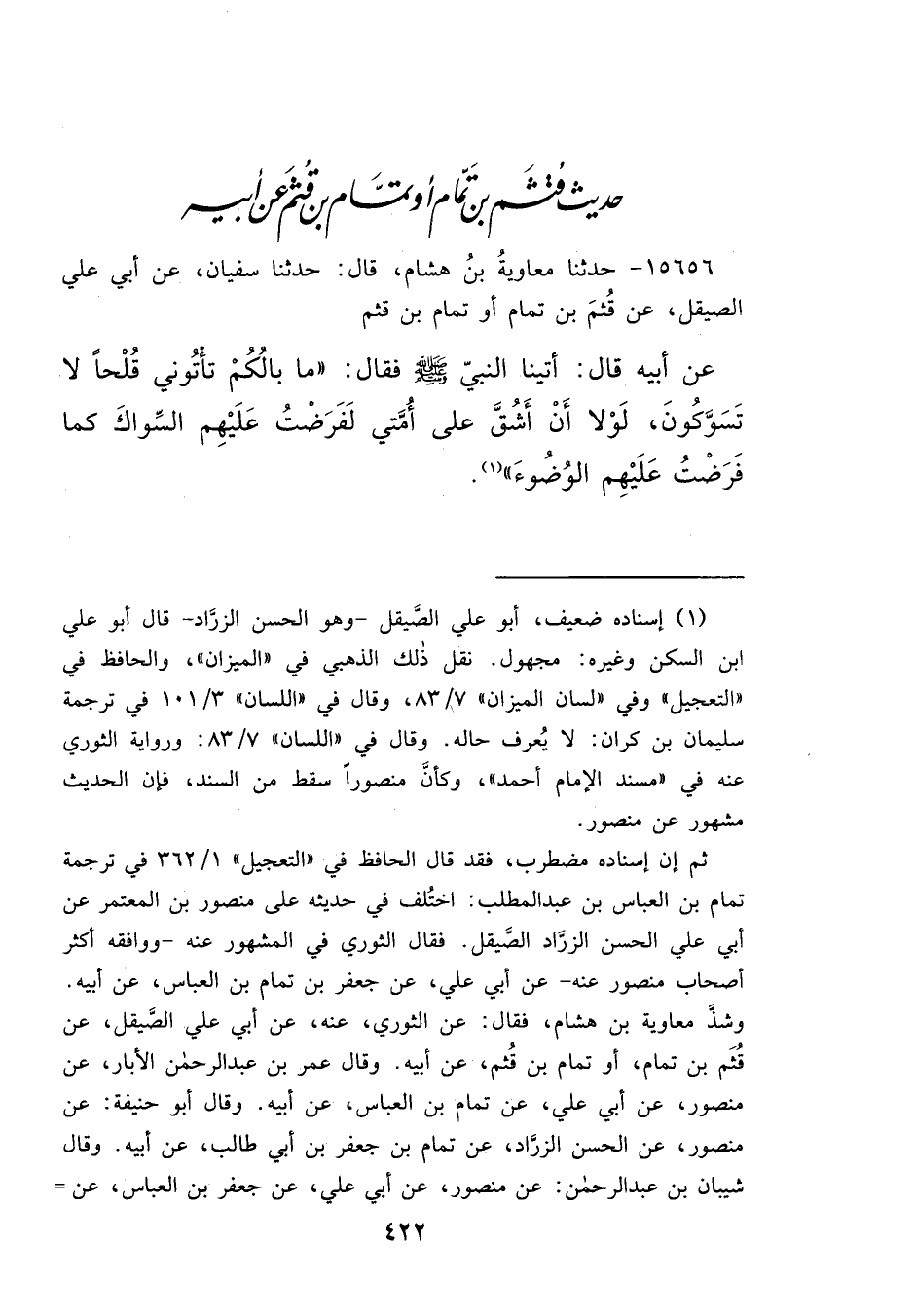 ١٥٦٥٦ - حَدَّثَنَا مُعَاوِيَةُ بْنُ هِشَامٍ، قَالَ: حَدَّثَنَا سُفْيَانُ، عَنْ أَبِي عَلِيٍّ الصَّيْقَلِ، عَنْ قُثَمِ بْنِ تَمَّامٍ أَوْ تَمَّامِ بْنِ قُثَمٍ، عَنْ أَبِيهِ، قَالَ: أَتَيْنَا النَّبِيَّ صَلَّى اللهُ عَلَيْهِ وَسَلَّمَ فَقَالَ: " " مَا بَالُكُمْ تَأْتُونِي قُلْحًا لَا تَسَوَّكُونَ، لَوْلَا أَنْ أَشُقَّ عَلَى أُمَّتِي لَفَرَضْتُ عَلَيْهِمُ السِّوَاكَ، كَمَا فَرَضْتُ عَلَيْهِمُ الْوُضُوءَ " " (١)