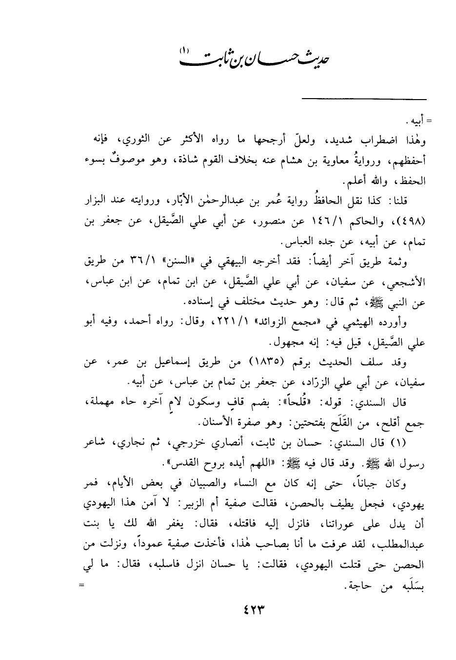 (١) قال السندي: حسان بن ثابت، أنصاري خزرجي، ثم نجاري، شاعر رسول الله صَلَّى اللهُ عَلَيْهِ وَسَلَّمَ. وقد قال فيه صَلَّى اللهُ عَلَيْهِ وَسَلَّمَ: "اللهم أيده بروح القدس".