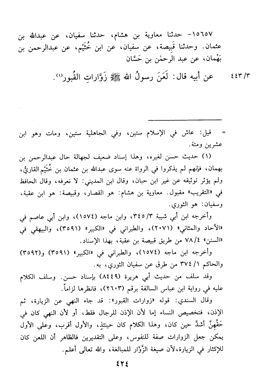 ١٥٦٥٧ - حَدَّثَنَا مُعَاوِيَةُ بْنُ هِشَامٍ، حَدَّثَنَا سُفْيَانُ، عَنْ عَبْدِ اللهِ بْنِ عُثْمَانَ، قَالَ أَبِي: وحَدَّثَنَا قَبِيصَةُ، عَنْ سُفْيَانَ، عَنِ ابْنِ خُثَيْمٍ، عَنْ عَبْدِ الرَّحْمَنِ بْنِ بَهْمَانَ، عَنْ عَبْدِ الرَّحْمَنِ بْنِ حَسَّانَ، عَنْ أَبِيهِ، قَالَ: " " لَعَنَ رَسُولُ اللهِ صَلَّى اللهُ عَلَيْهِ وَسَلَّمَ زَوَّارَاتِ الْقُبُورِ " " (١)