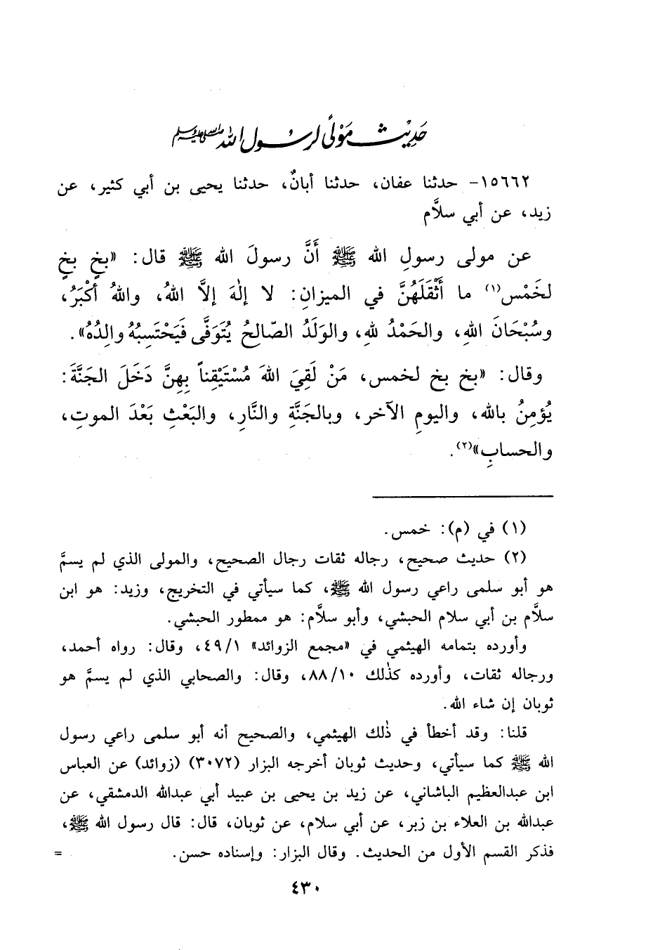 ١٥٦٦٢ - حَدَّثَنَا عَفَّانُ، حَدَّثَنَا أَبَانُ، حَدَّثَنَا يَحْيَى بْنُ أَبِي كَثِيرٍ، عَنْ زَيْدٍ، عَنْ أَبِي سَلَّامٍ، عَنْ مَوْلَى رَسُولِ اللهِ صَلَّى اللهُ عَلَيْهِ وَسَلَّمَ: أَنَّ رَسُولَ اللهِ صَلَّى اللهُ عَلَيْهِ وَسَلَّمَ قَالَ: " بَخٍ بَخٍ، لَخَمْسٌ (١) مَا أَثْقَلَهُنَّ فِي الْمِيزَانِ: لَا إِلَهَ إِلَّا اللهُ وَاللهُ أَكْبَرُ وَسُبْحَانَ اللهِ، وَالْحَمْدُ لِلَّهِ، وَالْوَلَدُ الصَّالِحُ يُتَوَفَّى فَيَحْتَسِبُهُ، وَالِدَاهُ " وَقَالَ: " بَخٍ بَخٍ لِخَمْسٍ مَنْ لَقِيَ اللهَ مُسْتَيْقِنًا بِهِنَّ دَخَلَ الْجَنَّةَ: يُؤْمِنُ بِاللهِ وَالْيَوْمِ الْآخِرِ، وَبِالْجَنَّةِ، وَالنَّارِ، وَالْبَعْثِ بَعْدَ الْمَوْتِ، وَالْحِسَابِ " (٢)