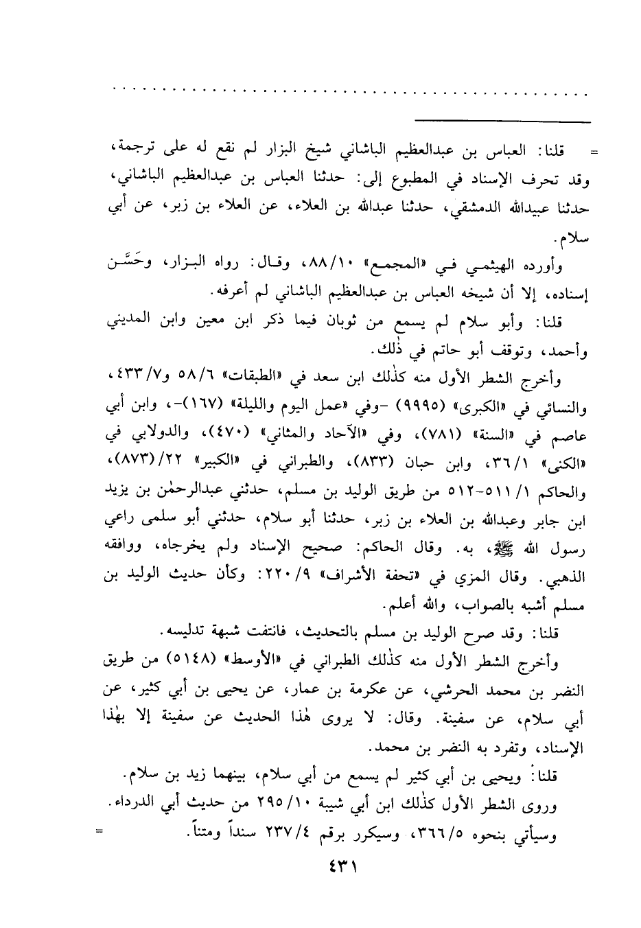 = قلنا: العباس بن عبد العظيم الباشاني شيخ البزار لم نقع له على ترجمة، وقد تحرف الإسناد في المطبوع إلى: حدثنا العباس بن عبد العظيم الباشاني، حدثنا عبيد الله الدمشقي، حدثنا عبد الله بن العلاء، عن العلاء بن زبر، عن أبي سلام.