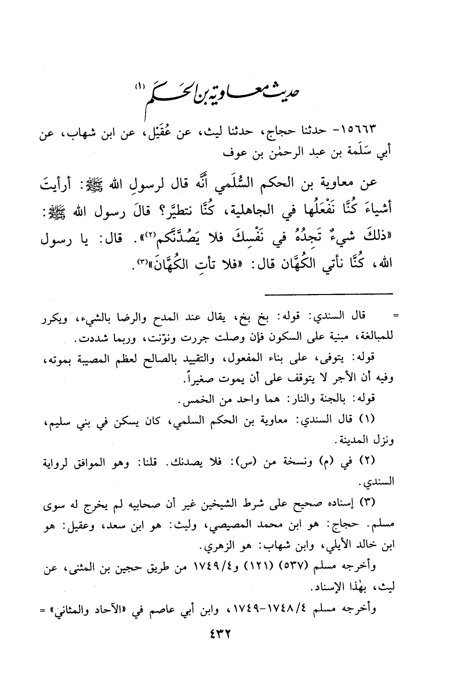 ١٥٦٦٣ - حَدَّثَنَا حَجَّاجٌ، حَدَّثَنَا لَيْثٌ، عَنْ عُقَيْلٍ، عَنِ ابْنِ شِهَابٍ، عَنْ أَبِي سَلَمَةَ بْنِ عَبْدِ الرَّحْمَنِ بْنِ عَوْفٍ، عَنْ مُعَاوِيَةَ بْنِ الْحَكَمِ السُّلَمِيِّ، أَنَّهُ قَالَ لِرَسُولِ اللهِ صَلَّى اللهُ عَلَيْهِ وَسَلَّمَ: أَرَأَيْتَ أَشْيَاءَ كُنَّا نَفْعَلُهَا فِي الْجَاهِلِيَّةِ، كُنَّا نَتَطَيَّرُ؟ قَالَ رَسُولُ اللهِ صَلَّى اللهُ عَلَيْهِ وَسَلَّمَ: " ذَلِكَ شَيْءٌ تَجِدُهُ فِي نَفْسِكَ، فَلَا يَصُدَّنَّكُمْ " (٢) قَالَ: يَا رَسُولَ اللهِ، كُنَّا نَأْتِي الْكُهَّانَ، قَالَ: " فَلَا تَأْتِ الْكُهَّانَ " (٣)