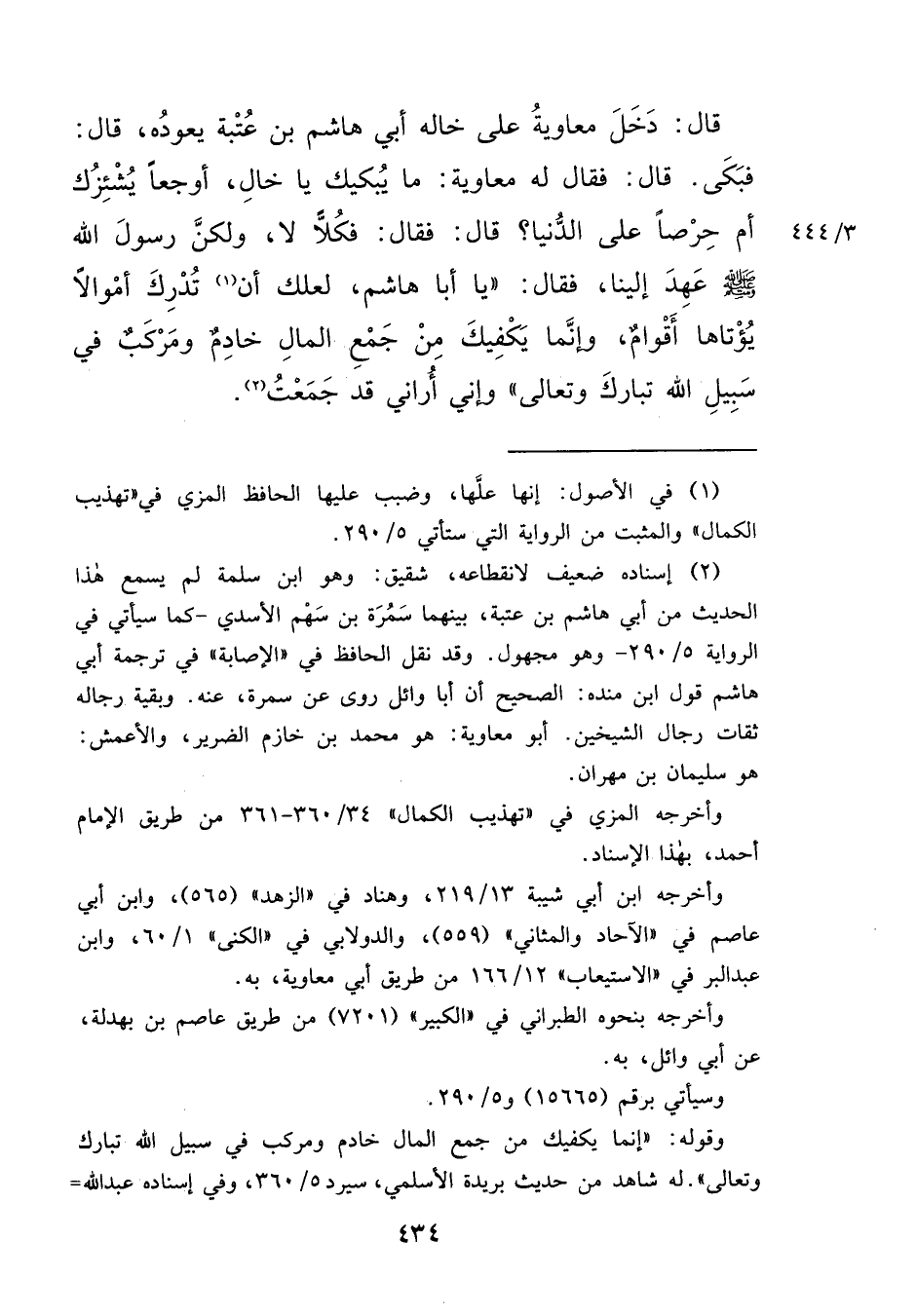 قَالَ: دَخَلَ مُعَاوِيَةُ عَلَى خَالِهِ أَبِي هَاشِمِ بْنِ عُتْبَةَ يَعُودُهُ، قَالَ: فَبَكَى، قَالَ: فَقَالَ لَهُ مُعَاوِيَةُ: مَا يُبْكِيكَ يَا خَالُ؟ أَوَجَعًا يُشْئِزُكَ أَمْ حِرْصًا عَلَى الدُّنْيَا؟ قَالَ: فَقَالَ: فَكُلًّا لَا، وَلَكِنَّ رَسُولَ اللهِ صَلَّى اللهُ عَلَيْهِ وَسَلَّمَ عَهِدَ إِلَيْنَا فَقَالَ: " يَا أَبَا هَاشِمٍ لَعَلَّكَ أَنْ (١) تُدْرِكَ أَمْوَالًا يُؤْتَاهَا أَقْوَامٌ، وَإِنَّمَا يَكْفِيكَ مِنْ جَمْعِ الْمَالِ خَادِمٌ، وَمَرْكَبٌ فِي سَبِيلِ اللهِ تَبَارَكَ وَتَعَالَى "، وَإِنِّي أُرَانِي قَدْ جَمَعْتُ (٢)