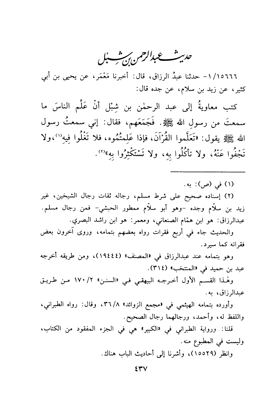 ١٥٦٦٦/١ - حَدَّثَنَا عَبْدُ الرَّزَّاقِ، قَالَ: أَخْبَرَنَا مَعْمَرٌ، عَنْ يَحْيَى بْنِ أَبِي كَثِيرٍ، عَنْ زَيْدِ بْنِ سَلَّامٍ، عَنْ جَدِّهِ، قَالَ: كَتَبَ مُعَاوِيَةُ إِلَى عَبْدِ الرَّحْمَنِ بْنِ شِبْلٍ أَنْ عَلِّمِ النَّاسَ مَا سَمِعْتَ مِنْ رَسُولِ اللهِ صَلَّى اللهُ عَلَيْهِ وَسَلَّمَ، فَجَمَعَهُمْ، فَقَالَ: إِنِّي سَمِعْتُ رَسُولَ اللهِ صَلَّى اللهُ عَلَيْهِ وَسَلَّمَ يَقُولُ: " تَعَلَّمُوا الْقُرْآنَ، فَإِذَا عَلِمْتُمُوهُ، فَلَا تَغْلُوا فِيهِ (١) ، وَلَا تَجْفُوا عَنْهُ، وَلَا تَأْكُلُوا بِهِ، وَلَا تَسْتَكْثِرُوا بِهِ " (٢)