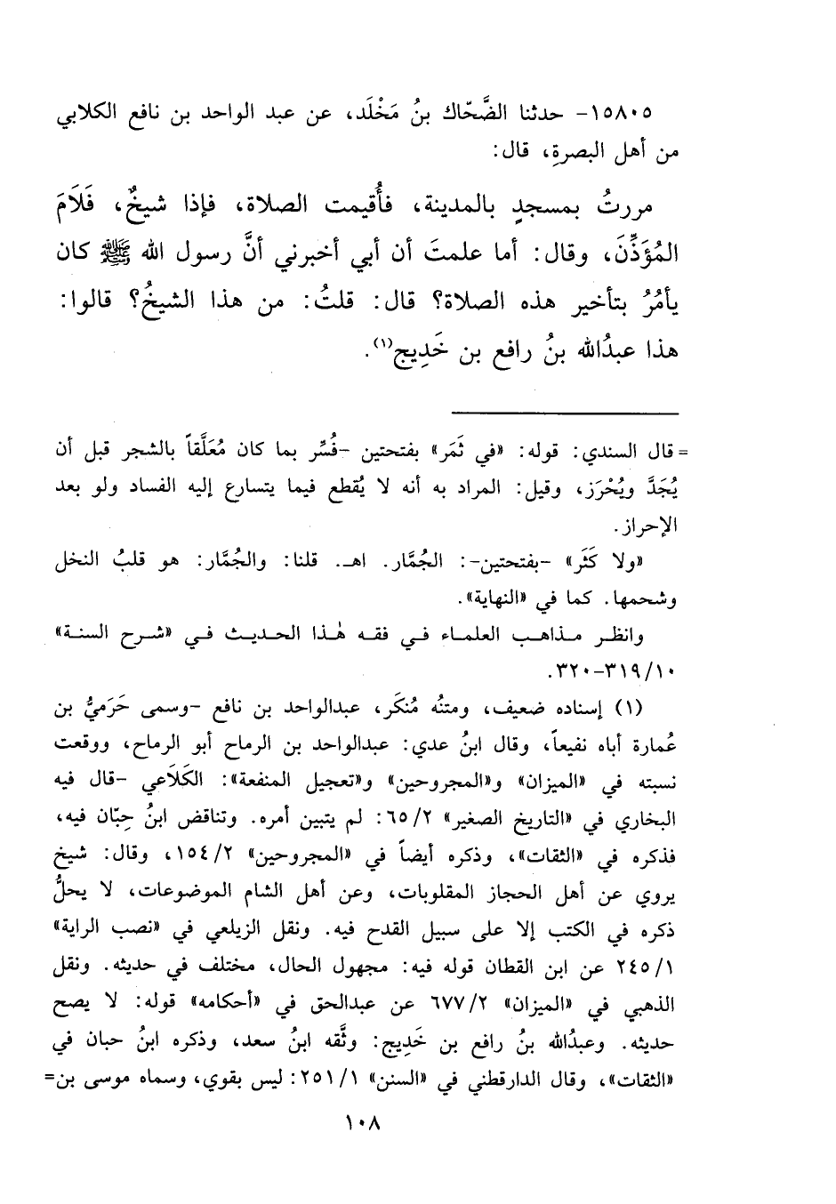 ١٥٨٠٥ - حَدَّثَنَا الضَّحَّاكُ بْنُ مَخْلَدٍ، عَنْ عَبْدِ الْوَاحِدِ بْنِ نَافِعٍ الكِلَابيِ، مِنْ أَهْلِ الْبَصْرَةِ، قَالَ: مَرَرْتُ بِمَسْجِدٍ بِالْمَدِينَةِ، فَأُقِيمَتِ الصَّلَاةُ فَإِذَا شَيْخٌ فَلَامَ الْمُؤَذِّنَ وَقَالَ: أَمَا عَلِمْتَ أَنَّ أَبِي أَخْبَرَنِي: " أَنَّ رَسُولَ اللهِ صَلَّى اللهُ عَلَيْهِ وَسَلَّمَ كَانَ يَأْمُرُ بِتَأْخِيرِ هَذِهِ الصَّلَاةِ " قَالَ: قُلْتُ: مَنْ هَذَا الشَّيْخُ؟ قَالُوا: هَذَا عَبْدُ اللهِ بْنُ رَافِعِ بْنِ خَدِيجٍ (١)