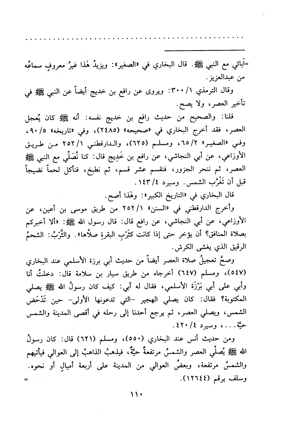 وصحَّ تعجيلُ صلاة العصر أيضأ من حديث أبي برزة الأسلمي عند البخاري (٥٤٧) ، ومسلم (٦٤٧) أخرجاه من طريق سيار بن سلامة قال: دخلتُ أنا وأبي على أبي بَرْزَة الأسلمي، فقال له أبي: كيف كان رسولُ الله يصلي المكتوبة؟ فقال: كان يصلي الهجير- التي تدعونها الأولى- حين تَدْحَض الشمس، ويصلي العصر، ثم يرجع أحدنا إلى رحله في أقصى المدينة والشمس حيَّة ... ، وسيرد ٤/٤٢٠.