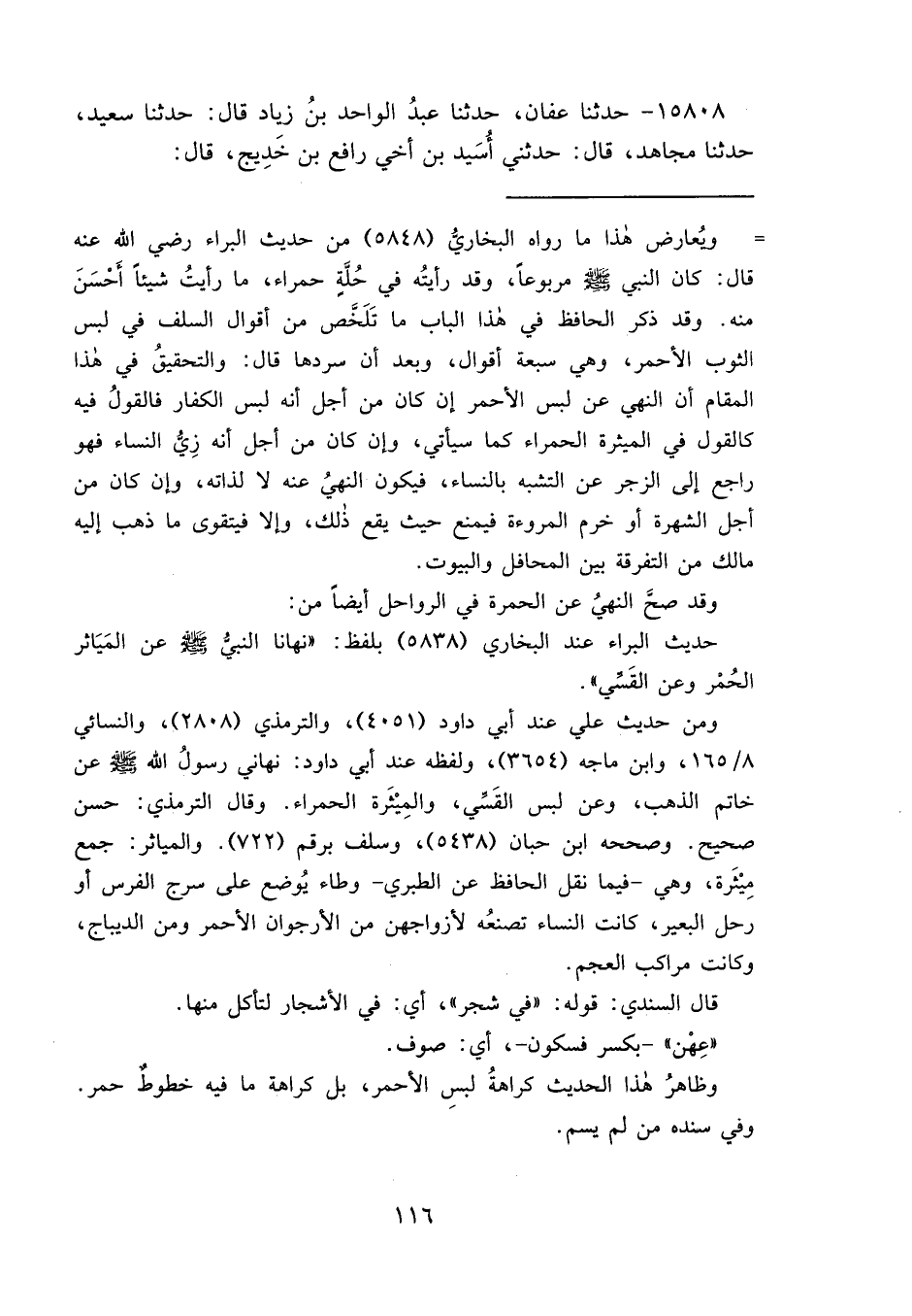 = ويُعارض هذا ما رواه البخاريُ (٥٨٤٨) من حديث البراء رضي الله عنه قال: كان النبي صَلَّى اللهُ عَلَيْهِ وَسَلَّمَ مربوعاً، وقد رأيتُه في حُلَّةٍ حمراء، ما رأيتُ شيئاً أَحْسَنَ منه. وقد ذكر الحافظ في هذا الباب ما تَلَخَّص من أقوال السلف في لبس الثوب الأحمر، وهي سبعة أقوال، وبعد أن سردها قال: والتحقيقُ في هذا المقام أن النهي عن لبس الأحمر إن كان من أجل أنه لبس الكفار فالقولُ فيه