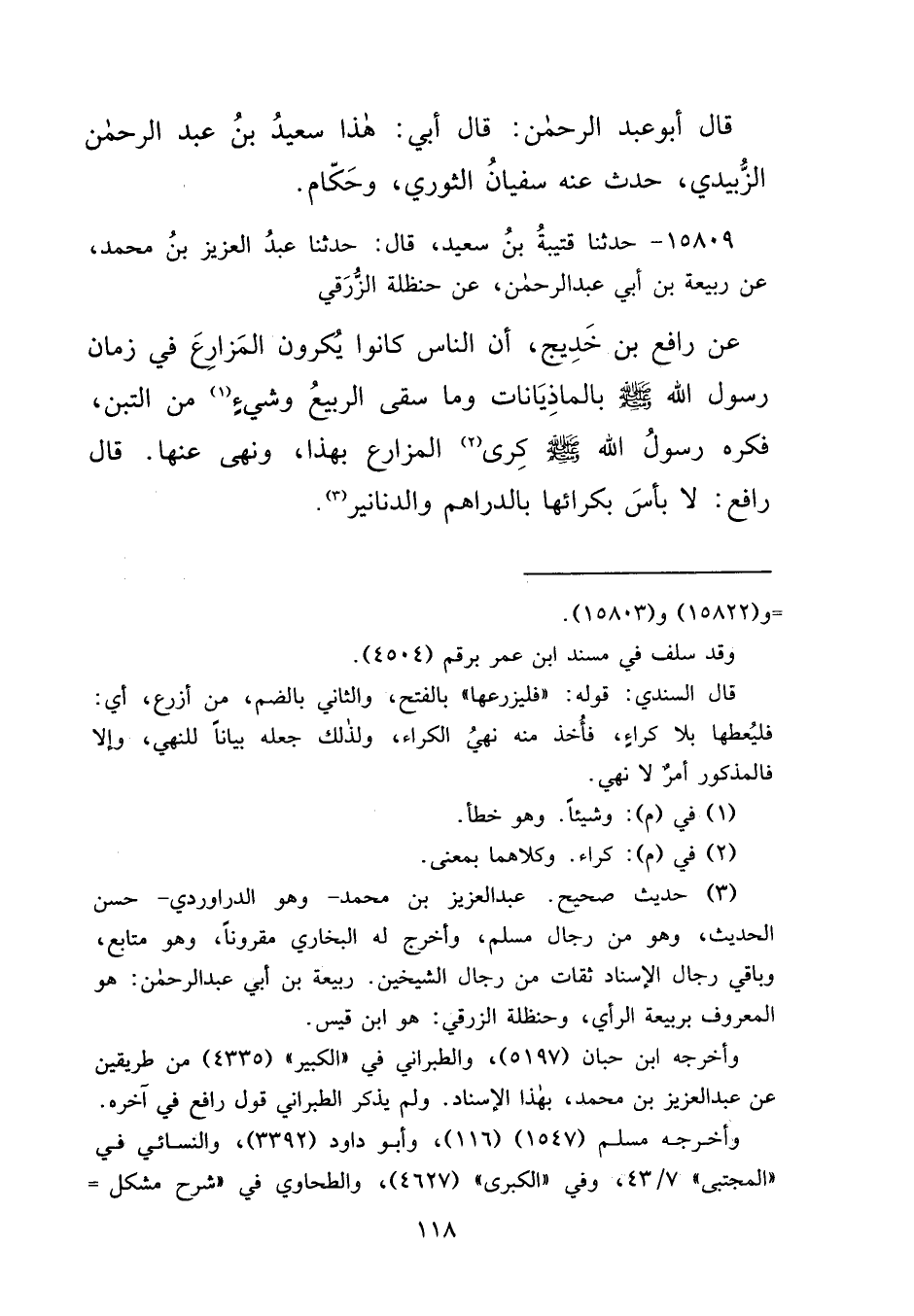 ١٥٨٠٩ - حَدَّثَنَا قُتَيْبَةُ بْنُ سَعِيدٍ، قَالَ: حَدَّثَنَا عَبْدُ الْعَزِيزِ بْنُ مُحَمَّدٍ، عَنْ رَبِيعَةَ بْنِ أَبِي عَبْدِ الرَّحْمَنِ، عَنْ حَنْظَلَةَ الزُّرَقِيِّ، عَنْ رَافِعِ بْنِ خَدِيجٍ، أَنَّ النَّاسَ كَانُوا يُكْرُونَ الْمَزَارِعَ فِي زَمَانِ رَسُولِ اللهِ صَلَّى اللهُ عَلَيْهِ وَسَلَّمَ بِالْمَاذِيَانَاتِ، وَمَا سَقَى الرَّبِيعُ، وَشَيْءٍ (١) مِنَ التِّبْنِ " فَكَرِهَ رَسُولُ اللهِ صَلَّى اللهُ عَلَيْهِ وَسَلَّمَ كِرَى (٢) الْمَزَارِعِ بِهَذَا، وَنَهَى عَنْهَا " قَالَ رَافِعٌ: " لَا بَأْسَ بِكِرَائِهَا بِالدَّرَاهِمِ وَالدَّنَانِيرِ " (٣)