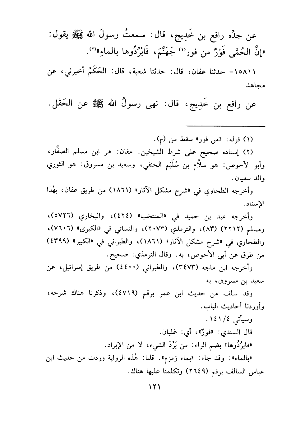 ١٥٨١١ - حَدَّثَنَا عَفَّانُ، قَالَ: حَدَّثَنَا شُعْبَةُ، قَالَ: الْحَكَمُ أَخْبَرَنِي عَنْ مُجَاهِدٍ، عَنْ رَافِعِ بْنِ خَدِيجٍ قَالَ: " نَهَى رَسُولُ اللهِ صَلَّى اللهُ عَلَيْهِ وَسَلَّمَ عَنِ الْحَقْلِ "
