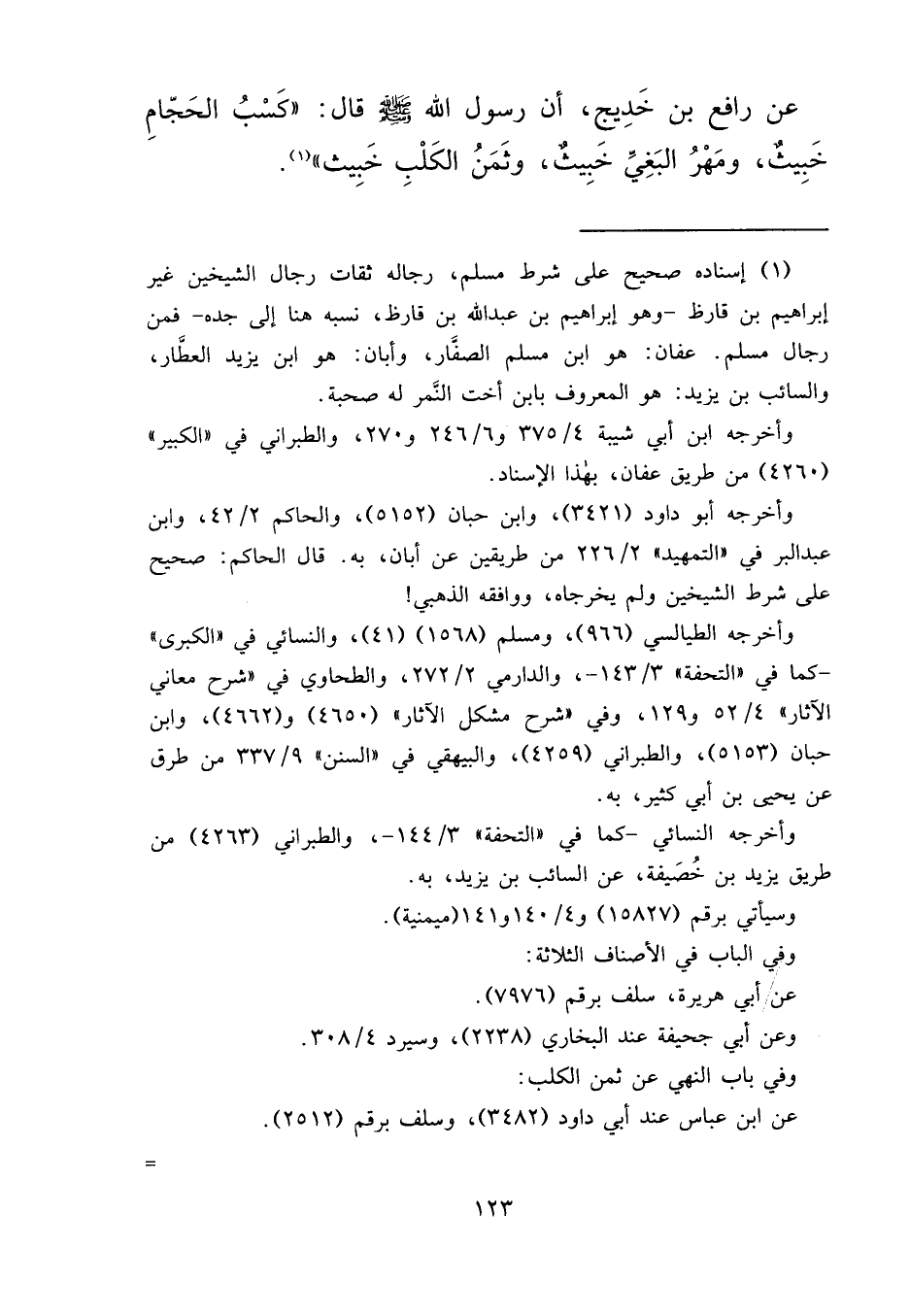 عَنْ رَافِعِ بْنِ خَدِيجٍ، أَنَّ رَسُولَ اللهِ صَلَّى اللهُ عَلَيْهِ وَسَلَّمَ قَالَ: " كَسْبُ الْحَجَّامِ خَبِيثٌ، وَمَهْرُ الْبَغِيِّ خَبِيثٌ، وَثَمَنُ الْكَلْبِ خَبِيثٌ " (١)