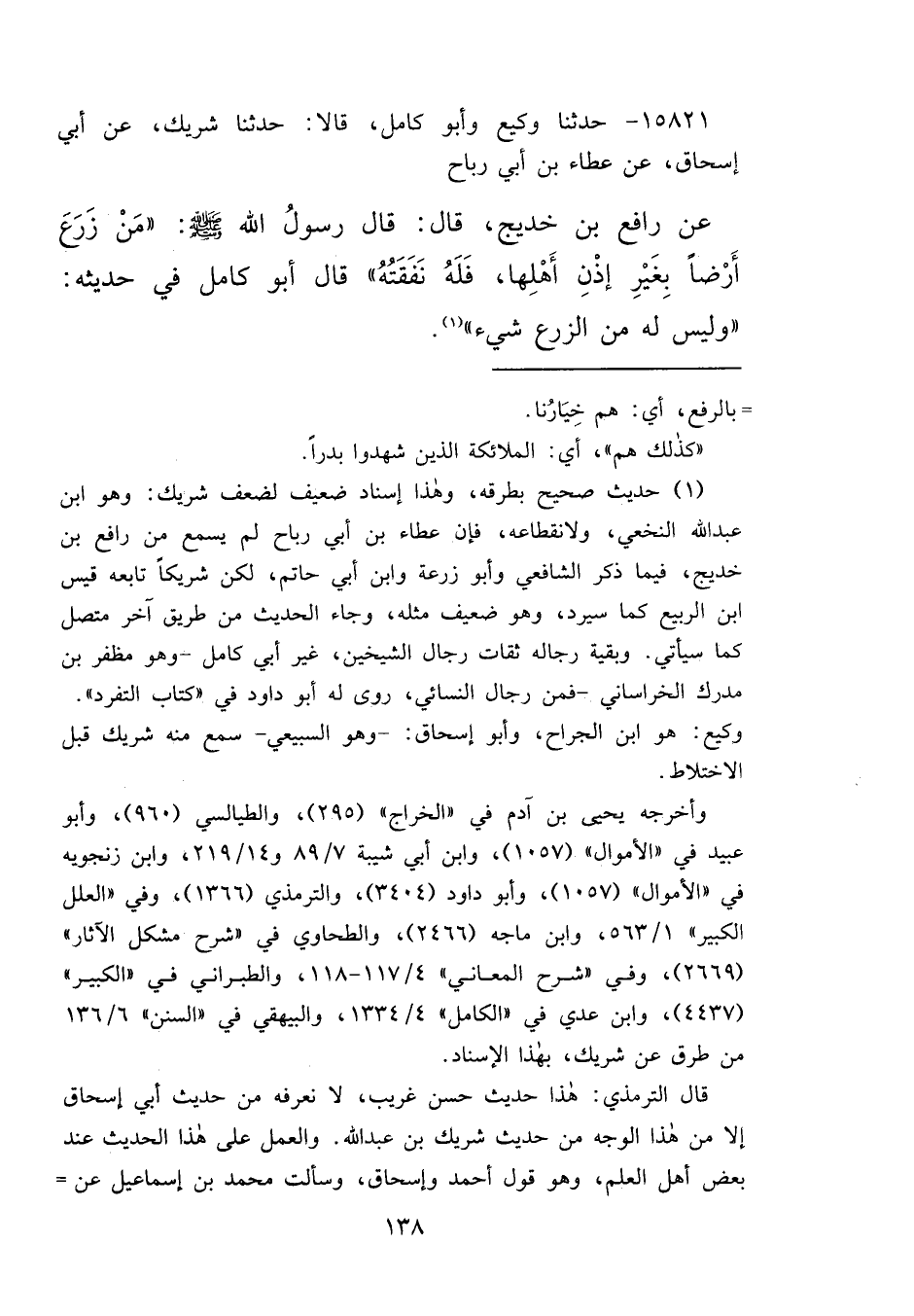 ١٥٨٢١ - حَدَّثَنَا وَكِيعٌ، وَأَبُو كَامِلٍ، قَالَا: حَدَّثَنَا شَرِيكٌ، عَنْ أَبِي إِسْحَاقَ، عَنْ عَطَاءِ بْنِ أَبِي رَبَاحٍ، عَنْ رَافِعِ بْنِ خَدِيجٍ، قَالَ: قَالَ رَسُولُ اللهِ صَلَّى اللهُ عَلَيْهِ وَسَلَّمَ: " مَنْ زَرَعَ أَرْضًا بِغَيْرِ إِذْنِ أَهْلِهَا فَلَهُ نَفَقَتُهُ " قَالَ أَبُو كَامِلٍ فِي حَدِيثِهِ: " وَلَيْسَ لَهُ مِنَ الزَّرْعِ شَيْءٌ " (١)