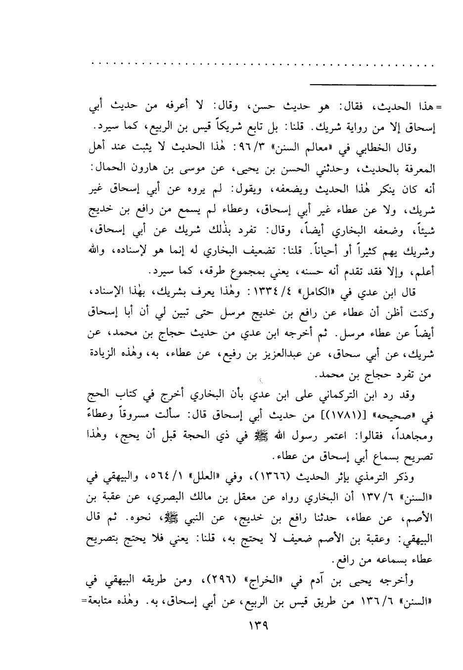 وقال الخطابي في "معالم السنن" ٣/٩٦: هذا الحديث لا يثبت عند أهل المعرفة بالحديث، وحدثني الحسن بن يحيى، عن موسى بن هارون الحمال: أنه كان ينكر هذا الحديث ويضعفه، ويقول: لم يروه عن أبي إسحاق غير شريك، ولا عن عطاء غير أبي إسحاق، وعطاء لم يسمع من رافع بن خديج شيئاً، وضعفه البخاري أيضاً، وقال: تفرد بذلك شريك عن أبي إسحاق، وشريك يهم كثيراً أو أحياناً. قلنا: تضعيف البخاري له إنما هو لإسناده، والله أعلم، وإلا فقد تقدم أنه حسنه، يعني بمجموع طرقه، كما سيرد.