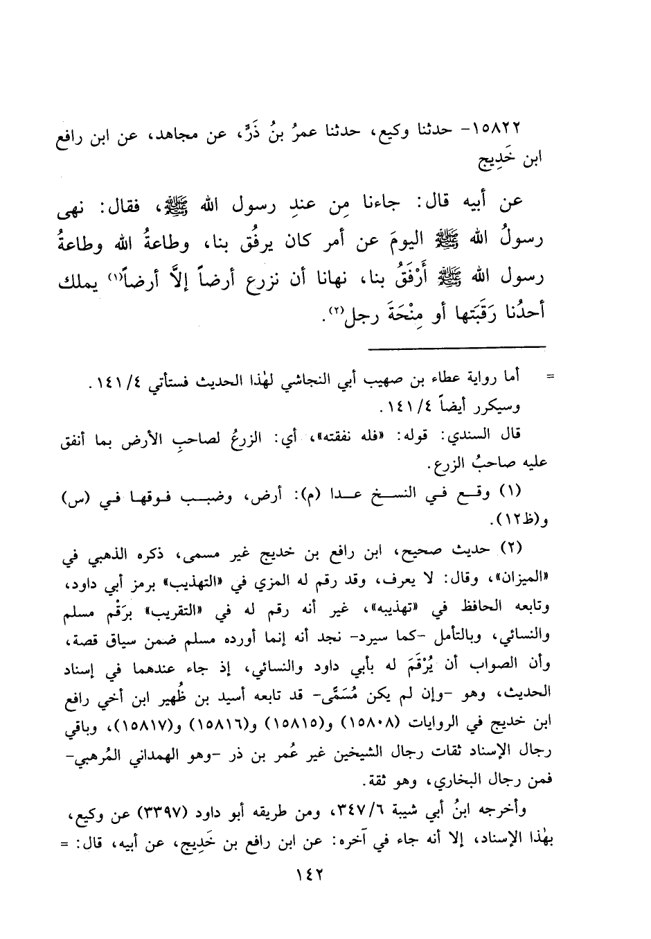 وأن الصواب أن يُرْقَمَ له بأبي داود والنسائي، إذ جاء عندهما في إسناد الحديث، وهو- وإن لم يكن مُسَمَّى- قد تابعه أسيد بن ظُهير ابن أخي رافع ابن خديج في الروايات (١٥٨٠٨) و (١٥٨١٥) و (١٥٨١٦) و (١٥٨١٧) ، وباقي رجال الإسناد ثقات رجال الشيخين غير عُمر بن ذر- وهو الهمداني المُرهبي- فمن رجال البخاري، وهو ثقة.