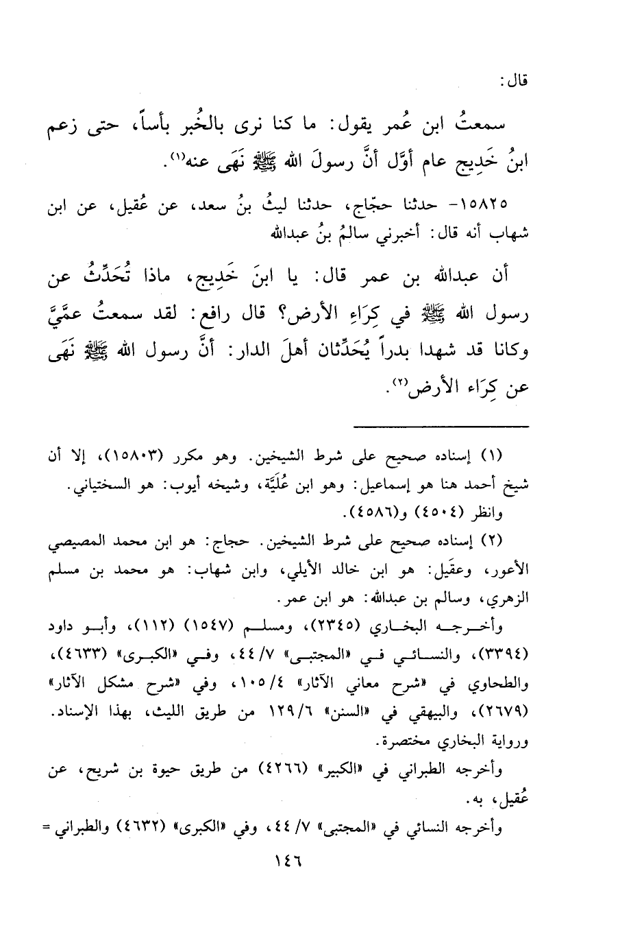 ١٥٨٢٥ - حَدَّثَنَا حَجَّاجٌ، حَدَّثَنَا لَيْثُ بْنُ سَعْدٍ، عَنْ عُقَيْلٍ، عَنِ ابْنِ شِهَابٍ، أَنَّهُ قَالَ: أَخْبَرَنِي سَالِمُ بْنُ عَبْدِ اللهِ، أَنَّ عَبْدَ اللهِ بْنَ عُمَرَ، قَالَ: يَا ابْنَ خَدِيجٍ مَاذَا تُحَدِّثُ عَنْ رَسُولِ اللهِ صَلَّى اللهُ عَلَيْهِ وَسَلَّمَ فِي كِرَاءِ الْأَرْضِ؟ قَالَ رَافِعٌ: لَقَدْ سَمِعْتُ عَمَّيَّ وَكَانَا قَدْ شَهِدَا بَدْرًا، يُحَدِّثَانِ أَهْلَ الدَّارِ " أَنَّ رَسُولَ اللهِ صَلَّى اللهُ عَلَيْهِ وَسَلَّمَ نَهَى عَنْ كِرَاءِ الْأَرْضِ " (٢)