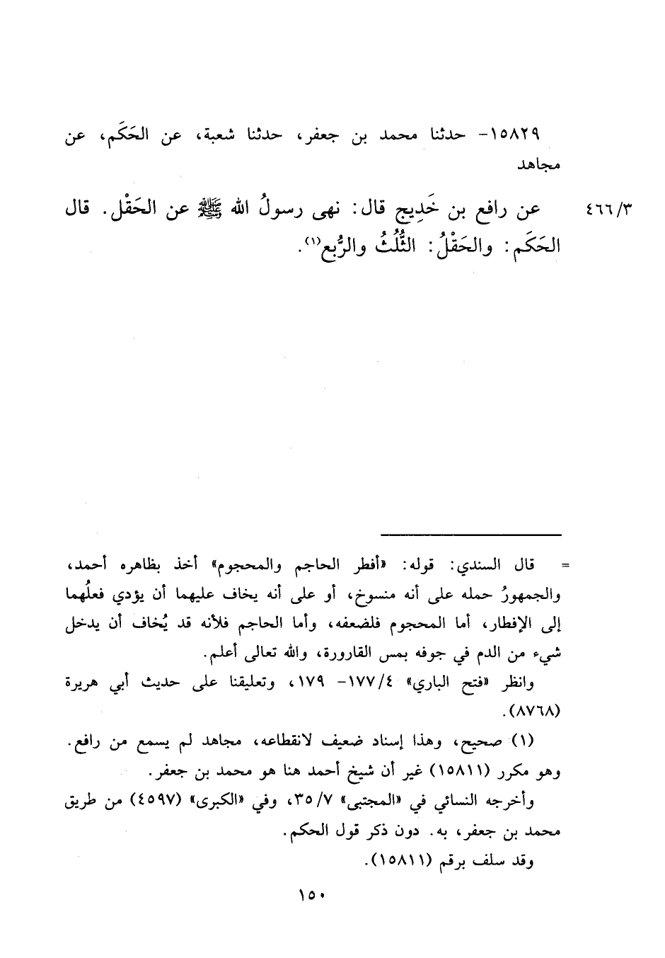 ١٥٨٢٩ - حَدَّثَنَا مُحَمَّدُ بْنُ جَعْفَرٍ، حَدَّثَنَا شُعْبَةُ، عَنِ الْحَكَمِ، عَنْ مُجَاهِدٍ، عَنْ رَافِعِ بْنِ خَدِيجٍ، قَالَ: " نَهَى رَسُولُ اللهِ صَلَّى اللهُ عَلَيْهِ وَسَلَّمَ عَنِ الْحَقْلِ " قَالَ الْحَكَمُ: وَالْحَقْلُ: الثُّلُثُ وَالرُّبُعُ (١)