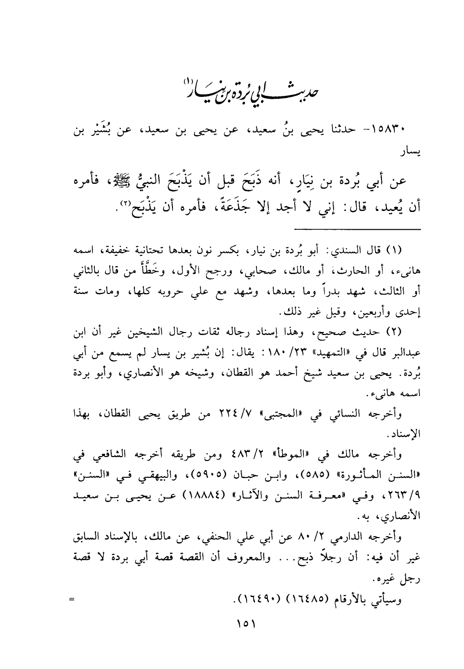 وأخرجه الدارمي ٢/٨٠ عن أبي علي الحنفي، عن مالك، بالإسناد السابق غير أن فيه: أن رجلاً ذبح ... والمعروف أن القصة قصة أبي بردة لا قصة رجل غيره.