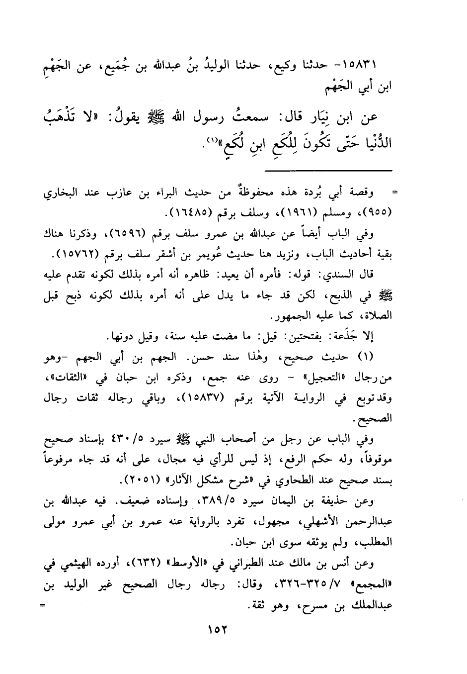 ١٥٨٣١ - حَدَّثَنَا وَكِيعٌ، حَدَّثَنَا الْوَلِيدُ بْنُ عَبْدِ اللهِ بْنِ جُمَيْعٍ، عَنِ الْجَهْمِ بْنِ أَبِي الْجَهْمِ، عَنْ ابْنِ نِيَارٍ، قَالَ: سَمِعْتُ رَسُولَ اللهِ صَلَّى اللهُ عَلَيْهِ وَسَلَّمَ يَقُولُ: " لَا تَذْهَبُ الدُّنْيَا حَتَّى تَكُونَ لِلُكَعِ ابْنِ لُكَعٍ " (١)
