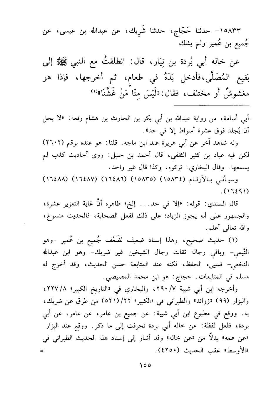 ١٥٨٣٣ - حَدَّثَنَا حَجَّاجٌ، حَدَّثَنَا شَرِيكٌ، عَنْ عَبْدِ اللهِ بْنِ عِيسَى، عَنْ جُمَيْعِ بْنِ عُمَيْرٍ، وَلَمْ يَشُكَّ عَنْ خَالِهِ أَبِي بُرْدَةَ بْنِ نِيَارٍ، قَالَ: انْطَلَقْتُ مَعَ النَّبِيِّ صَلَّى اللهُ عَلَيْهِ وَسَلَّمَ إِلَى بَقِيعِ الْمُصَلَّى، فَأَدْخَلَ يَدَهُ فِي طَعَامٍ، ثُمَّ أَخْرَجَهَا فَإِذَا هُوَ مَغْشُوشٌ - أَوْ مُخْتَلِفٌ - فَقَالَ: " لَيْسَ مِنَّا مَنْ غَشَّنَا " (١)