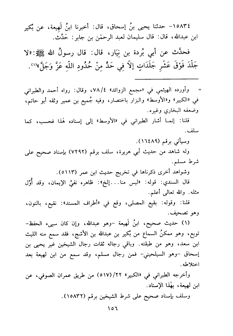 ١٥٨٣٤ - حَدَّثَنَا يَحْيَى بْنُ إِسْحَاقَ، قَالَ: أَخْبَرَنَا ابْنُ لَهِيعَةَ، عَنْ بُكَيْرِ بْنِ عَبْدِ اللهِ، قَالَ: قَالَ سُلَيْمَانُ لِعَبْدِ الرَّحْمَنِ بْنِ جَابِرٍ حَدِّثْ، فَحَدَّثَ عَنْ أَبِي بُرْدَةَ بْنِ نِيَارٍ، قَالَ: قَالَ رَسُولُ اللهِ صَلَّى اللهُ عَلَيْهِ وَسَلَّمَ: " لَا جَلْدَ فَوْقَ عَشْرِ جَلَدَاتٍ، إِلَّا فِي حَدٍّ مِنْ حُدُودِ اللهِ عَزَّ وَجَلَّ " (١)