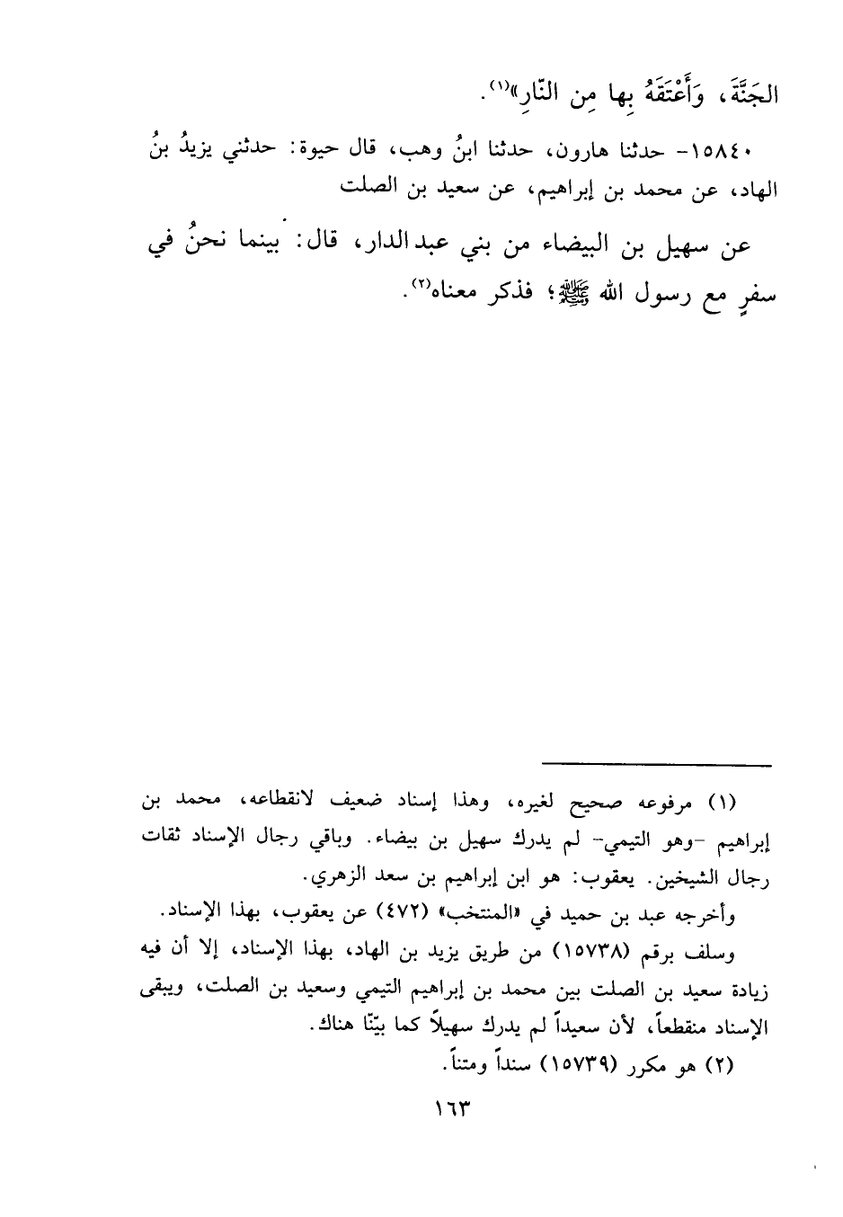 ١٥٨٤٠ - حَدَّثَنَا هَارُونُ، حَدَّثَنَا ابْنُ وَهْبٍ، قَالَ حَيْوَةُ: حَدَّثَنِي يَزِيدُ بْنُ الْهَادِ، عَنْ مُحَمَّدِ بْنِ إِبْرَاهِيمَ، عَنْ سَعِيدِ بْنِ الصَّلْتِ، عَنْ سُهَيْلِ ابْنِ الْبَيْضَاءِ مِنْ بَنِي عَبْدِ الدَّارِ، قَالَ: بَيْنَمَا نَحْنُ فِي سَفَرٍ مَعَ رَسُولِ اللهِ صَلَّى اللهُ عَلَيْهِ وَسَلَّمَ، فَذَكَرَ مَعْنَاهُ (٢)