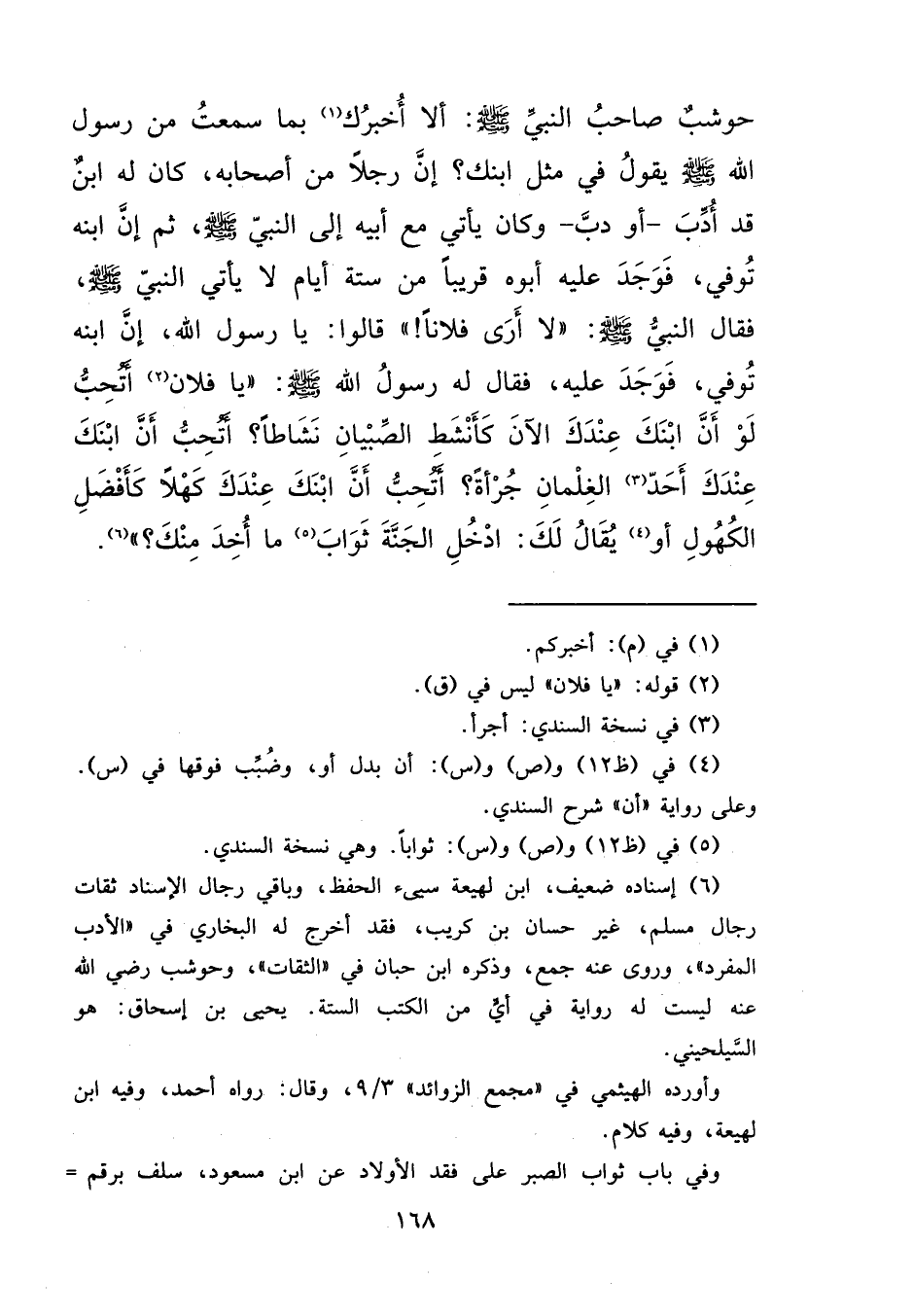 حَوْشَبٌ صَاحِبُ النَّبِيِّ صَلَّى اللهُ عَلَيْهِ وَسَلَّمَ: أَلَا أُخْبِرُكُ (١) بِمَا سَمِعْتُ مِنْ رَسُولِ اللهِ صَلَّى اللهُ عَلَيْهِ وَسَلَّمَ يَقُولُ فِي مِثْلِ ابْنِكَ؟ إِنَّ رَجُلًا مِنْ أَصْحَابِهِ كَانَ لَهُ ابْنٌ قَدْ أَدَبَّ - أَوْ دَبَّ - وَكَانَ يَأْتِي مَعَ أَبِيهِ إِلَى النَّبِيِّ صَلَّى اللهُ عَلَيْهِ وَسَلَّمَ، ثُمَّ إِنَّ ابْنَهُ تُوُفِّيَ، فَوَجَدَ عَلَيْهِ أَبُوهُ قَرِيبًا مِنْ سِتَّةِ أَيَّامٍ، لَا يَأْتِي النَّبِيَّ صَلَّى اللهُ عَلَيْهِ وَسَلَّمَ، فَقَالَ النَّبِيُّ صَلَّى اللهُ عَلَيْهِ وَسَلَّمَ: " لَا أَرَى فُلَانًا " قَالُوا: يَا رَسُولَ اللهِ، إِنَّ ابْنَهُ تُوُفِّيَ فَوَجَدَ عَلَيْهِ، فَقَالَ لَهُ رَسُولُ اللهِ صَلَّى اللهُ عَلَيْهِ وَسَلَّمَ: " يَا فُلَانُ (٢) ، أَتُحِبُّ لَوْ أَنَّ ابْنَكَ عِنْدَكَ الْآنَ كَأَنْشَطِ الصِّبْيَانِ نَشَاطًا، أَتُحِبُّ أَنَّ ابْنَكَ عِنْدَكَ أَحَدُّ (٣) الْغِلْمَانِ جرأَةً، أَتُحِبُّ أَنَّ ابْنَكَ عِنْدَكَ كَهْلًا كَأَفْضَلِ الْكُهُولِ، أَوْ (٤) يُقَالُ لَكَ ادْخُلِ الْجَنَّةَ ثَوَابَ (٥) مَا أُخِذَ مِنْكَ " (٦)