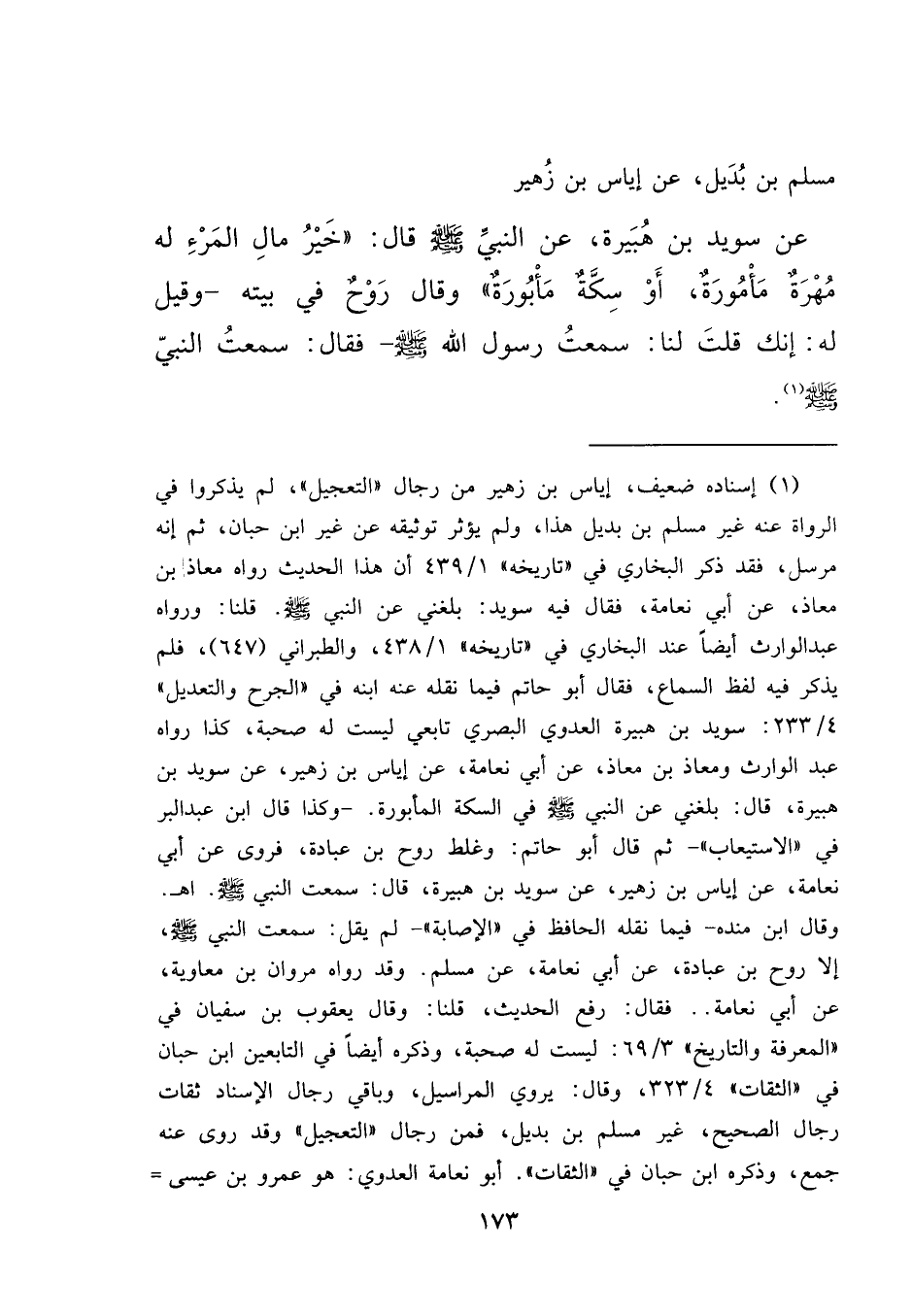 وقال ابن منده- فيما نقله الحافظ في "الإصابة"- لم يقل: سمعت النبي صَلَّى اللهُ عَلَيْهِ وَسَلَّمَ، إلا روح بن عبادة، عن أبي نعامة، عن مسلم. وقد رواه مروان بن معاوية، عن أبي نعامة.. فقال: رفع الحديث، قلنا: وقال يعقوب بن سفيان في "المعرفة والتاريخ" ٣/٦٩: ليست له صحبة، وذكره أيضاً في التابعين ابن حبان في "الثقات" ٤/٣٢٣، وقال: يروي المراسيل، وباقي رجال الإسناد ثقات