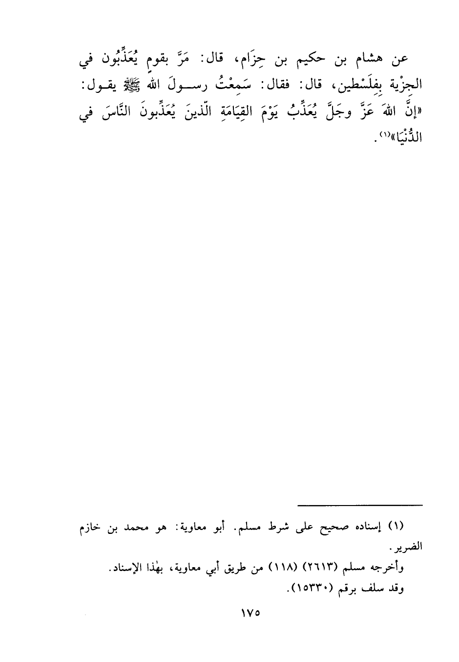 عَنْ هِشَامِ بْنِ حَكِيمِ بْنِ حِزَامٍ، قَالَ: مَرَّ بِقَوْمٍ يُعَذَّبُونَ فِي الْجِزْيَةِ بِفِلَسْطِينَ، قَالَ: فَقَالَ سَمِعْتُ رَسُولَ اللهِ صَلَّى اللهُ عَلَيْهِ وَسَلَّمَ يَقُولُ: " إِنَّ اللهَ عَزَّ وَجَلَّ يُعَذِّبُ يَوْمَ الْقِيَامَةِ الَّذِينَ يُعَذِّبُونَ النَّاسَ فِي الدُّنْيَا " (١)