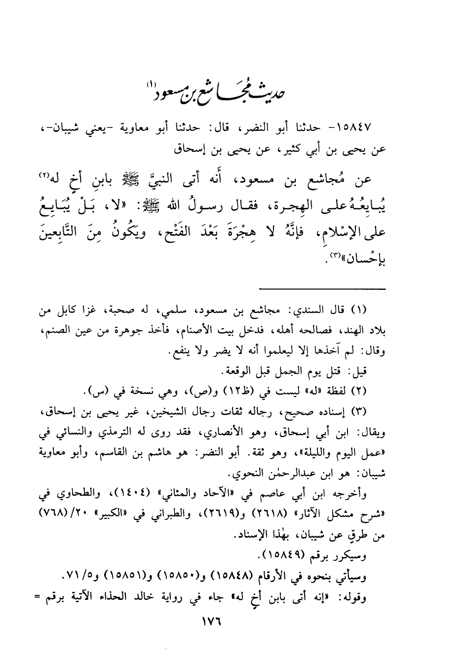 ١٥٨٤٧ - حَدَّثَنَا أَبُو النَّضْرِ، قَالَ: حَدَّثَنَا أَبُو مُعَاوِيَةَ يَعْنِي شَيْبَانَ، عَنْ يَحْيَى بْنِ أَبِي كَثِيرٍ، عَنْ يَحْيَى بْنِ إِسْحَاقَ، عَنْ مُجَاشِعِ بْنِ مَسْعُودٍ، أَنَّهُ أَتَى النَّبِيَّ صَلَّى اللهُ عَلَيْهِ وَسَلَّمَ بِابْنِ أَخٍ لَهُ (٢) يُبَايِعُهُ عَلَى الْهِجْرَةِ، فَقَالَ رَسُولُ اللهِ صَلَّى اللهُ عَلَيْهِ وَسَلَّمَ: " لَا بَلْ يُبَايِعُ عَلَى الْإِسْلَامِ فَإِنَّهُ، لَا هِجْرَةَ بَعْدَ الْفَتْحِ، وَيَكُونُ مِنَ التَّابِعِينَ بِإِحْسَانٍ " (٣)