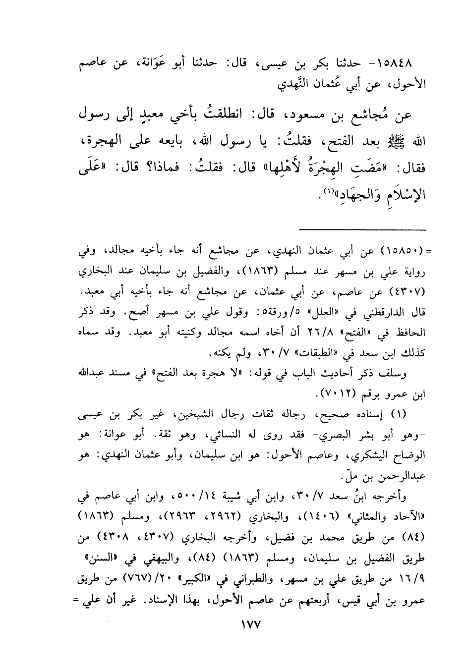 ١٥٨٤٨ - حَدَّثَنَا بَكْرُ بْنُ عِيسَى، قَالَ: حَدَّثَنَا أَبُو عَوَانَةَ، عَنْ عَاصِمٍ الْأَحْوَلِ، عَنْ أَبِي عُثْمَانَ النَّهْدِيِّ، عَنْ مُجَاشِعِ بْنِ مَسْعُودٍ، قَالَ: انْطَلَقْتُ بِأَخِي مَعْبَدٍ إِلَى رَسُولِ اللهِ صَلَّى اللهُ عَلَيْهِ وَسَلَّمَ بَعْدَ الْفَتْحِ، فَقُلْتُ: يَا رَسُولَ اللهِ، بَايِعْهُ عَلَى الْهِجْرَةِ، فَقَالَ: " مَضَتِ الْهِجْرَةُ لِأَهْلِهَا " قَالَ: فَقُلْتُ: فَمَاذَا قَالَ: " عَلَى الْإِسْلَامِ وَالْجِهَادِ " (١)