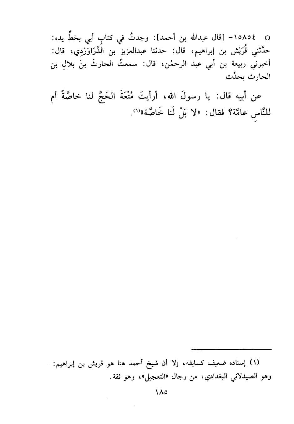 ° ١٥٨٥٤ -[قَالَ عَبْدُ اللهِ بْنُ أًحْمَدَ] : وَجَدْتُ فِي كِتَابِ أَبِي بِخَطِّ يَدِهِ: حَدَّثَنِي قُرَيْشُ بْنُ إِبْرَاهِيمَ، قَالَ: حَدَّثَنَا عَبْدُ الْعَزِيزِ بْنُ الدَّرَاوَرْدِيُّ، قَالَ: أَخْبَرَنِي رَبِيعَةُ بْنُ أَبِي عَبْدِ الرَّحْمَنِ، قَالَ: سَمِعْتُ الْحَارِثَ بْنَ بِلَالِ بْنِ الْحَارِثِ، يُحَدِّثُ عَنْ أَبِيهِ، قَالَ: يَا رَسُولَ اللهِ، أَرَأَيْتَ مُتْعَةَ الْحَجِّ لَنَا خَاصَّةً أَمْ لِلنَّاسِ عَامَّةً؟ فَقَالَ: " لَا بَلْ لَنَا خَاصَّةً " (١)