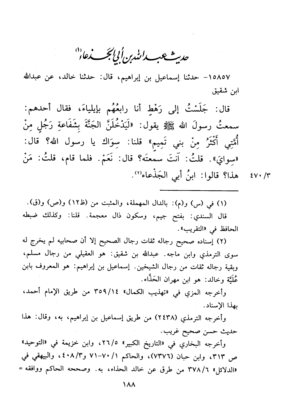 ١٥٨٥٧ - حَدَّثَنَا إِسْمَاعِيلُ بْنُ إِبْرَاهِيمَ، قَالَ: حَدَّثَنَا خَالِدٌ، عَنْ عَبْدِ اللهِ بْنِ شَقِيقٍ، قَالَ: جَلَسْتُ إِلَى رَهْطٍ أَنَا رَابِعُهُمْ، بِإِيلِيَاءَ، فَقَالَ أَحَدُهُمْ: سَمِعْتُ رَسُولَ اللهِ صَلَّى اللهُ عَلَيْهِ وَسَلَّمَ يَقُولُ: " لَيَدْخُلَنَّ الْجَنَّةَ بِشَفَاعَةِ رَجُلٍ مِنْ أُمَّتِي أَكْثَرُ مِنْ بَنِي تَمِيمٍ " قُلْنَا: سِوَاكَ يَا رَسُولَ اللهِ؟ قَالَ: " سِوَايَ " قُلْتُ: أَنْتَ سَمِعْتَهُ؟ قَالَ: نَعَمْ، فَلَمَّا قَامَ قُلْتُ: مَنْ هَذَا؟ قَالُوا: ابْنُ أَبِي الْجَذْعَاءِ (٢)