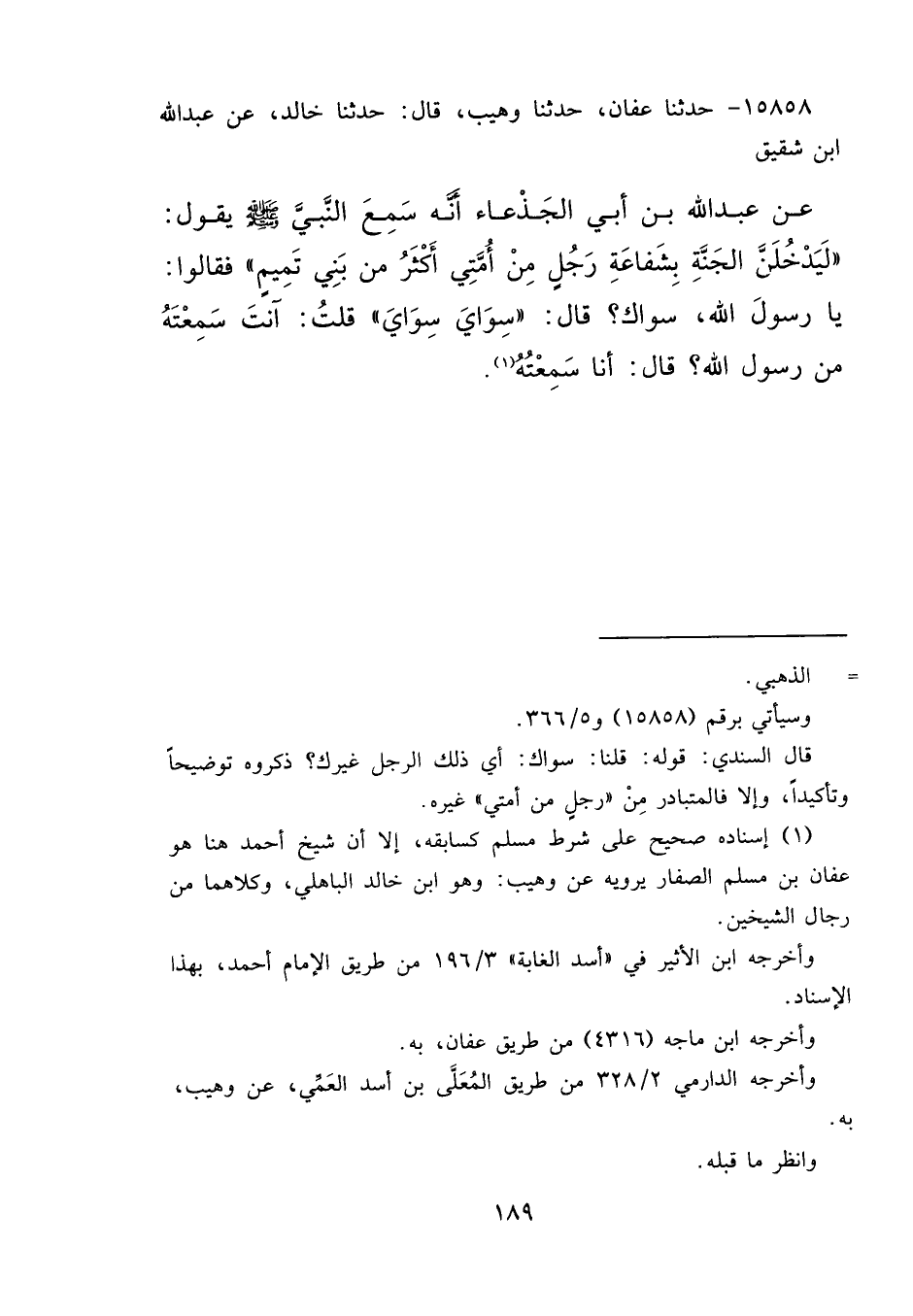 ١٥٨٥٨ - حَدَّثَنَا عَفَّانُ، حَدَّثَنَا وُهَيْبٌ، قَالَ: حَدَّثَنَا خَالِدٌ، عَنْ عَبْدِ اللهِ بْنِ شَقِيقٍ، عَنْ عَبْدِ اللهِ بْنِ أَبِي الْجَذْعَاءِ، أَنَّهُ سَمِعَ النَّبِيَّ صَلَّى اللهُ عَلَيْهِ وَسَلَّمَ يَقُولُ: " لَيَدْخُلَنَّ الْجَنَّةَ بِشَفَاعَةِ رَجُلٍ مِنْ أُمَّتِي أَكْثَرُ مِنْ بَنِي تَمِيمٍ " فَقَالُوا: يَا رَسُولَ اللهِ، سِوَاكَ؟ قَالَ: " سِوَايَ سِوَايَ " قُلْتُ: آنْتَ سَمِعْتَهُ مِنْ رَسُولِ اللهِ؟ قَالَ: أَنَا سَمِعْتُهُ (١)