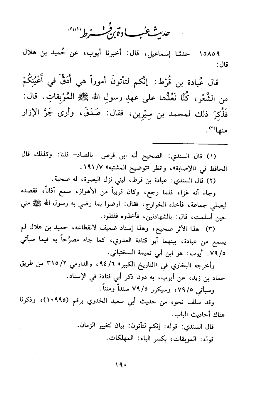 ١٥٨٥٩ - حَدَّثَنَا إِسْمَاعِيلُ، قَالَ: أَخْبَرَنَا أَيُّوبُ، عَنْ حُمَيْدِ بْنِ هِلَالٍ، قَالَ: قَالَ عُبَادَةُ بْنُ قُرْطٍ: " إِنَّكُمْ لَتَأْتُونَ أُمُورًا هِيَ أَدَقُّ فِي أَعْيُنِكُمْ مِنَ الشَّعَرِ، كُنَّا نَعُدُّهَا عَلَى عَهْدِ رَسُولِ اللهِ صَلَّى اللهُ عَلَيْهِ وَسَلَّمَ الْمُوبِقَاتِ " قَالَ: فَذُكِرَ ذَلِكَ لِمُحَمَّدِ بْنِ سِيرِينَ، فَقَالَ: " صَدَقَ وَأَرَى جَرَّ الْإِزَارِ مِنْهَا " (٣)