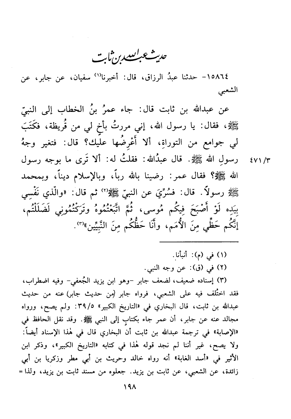 ١٥٨٦٤ - حَدَّثَنَا عَبْدُ الرَّزَّاقِ، قَالَ: أَخْبَرَنَا (١) سُفْيَانُ، عَنْ جَابِرٍ، عَنْ الشَّعْبِيِّ، عَنْ عَبْدِ اللهِ بْنِ ثَابِتٍ، قَالَ: جَاءَ عُمَرُ بْنُ الْخَطَّابِ إِلَى النَّبِيِّ صَلَّى اللهُ عَلَيْهِ وَسَلَّمَ، فَقَالَ: يَا رَسُولَ اللهِ إِنِّي مَرَرْتُ بِأَخٍ لِي مِنْ قُرَيْظَةَ، فَكَتَبَ لِي جَوَامِعَ مِنَ التَّوْرَاةِ أَلَا أَعْرِضُهَا عَلَيْكَ؟ قَالَ: فَتَغَيَّرَ وَجْهُ رَسُولِ اللهِ صَلَّى اللهُ عَلَيْهِ وَسَلَّمَ، قَالَ عَبْدُ اللهِ: فَقُلْتُ لَهُ: أَلَا تَرَى مَا بِوَجْهِ رَسُولِ اللهِ صَلَّى اللهُ عَلَيْهِ وَسَلَّمَ؟ فَقَالَ عُمَرُ: رَضِينَا بِاللهِ رَبًّا، وَبِالْإِسْلَامِ دِينًا، وَبِمُحَمَّدٍ صَلَّى اللهُ عَلَيْهِ وَسَلَّمَ رَسُولًا، قَالَ: فَسُرِّيَ عَنِ النَّبِيِّ صَلَّى اللهُ عَلَيْهِ وَسَلَّمَ (٢) ، ثُمَّ قَالَ: " وَالَّذِي نَفْسِي بِيَدِهِ، لَوْ أَصْبَحَ فِيكُمْ مُوسَى ثُمَّ اتَّبَعْتُمُوهُ، وَتَرَكْتُمُونِي لَضَلَلْتُمْ، إِنَّكُمْ حَظِّي مِنَ الْأُمَمِ، وَأَنَا حَظُّكُمْ مِنَ النَّبِيِّينَ " (٣)