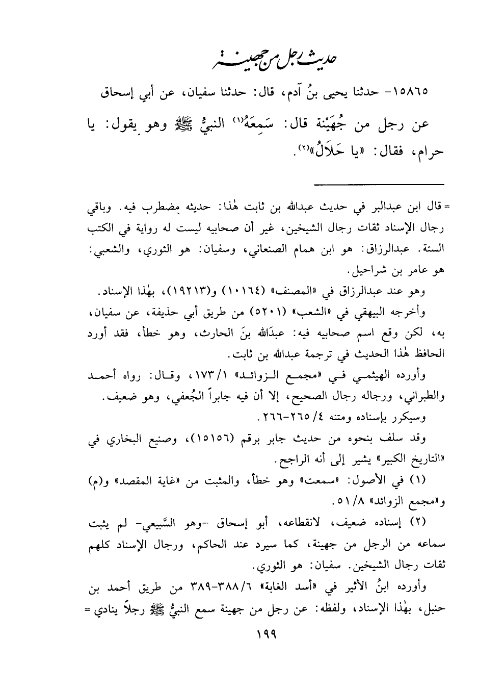 ١٥٨٦٥ - حَدَّثَنَا يَحْيَى بْنُ آدَمَ، قَالَ: حَدَّثَنَا سُفْيَانُ، عَنْ أَبِي إِسْحَاقَ، عَنْ رَجُلٍ مِنْ جُهَيْنَةَ، قَالَ: سَمِعَهُ (١) النَّبِيُّ صَلَّى اللهُ عَلَيْهِ وَسَلَّمَ وَهُوَ يَقُولُ: " يَا حَرَامُ " فَقَالَ: " يَا حَلَالُ " (٢)