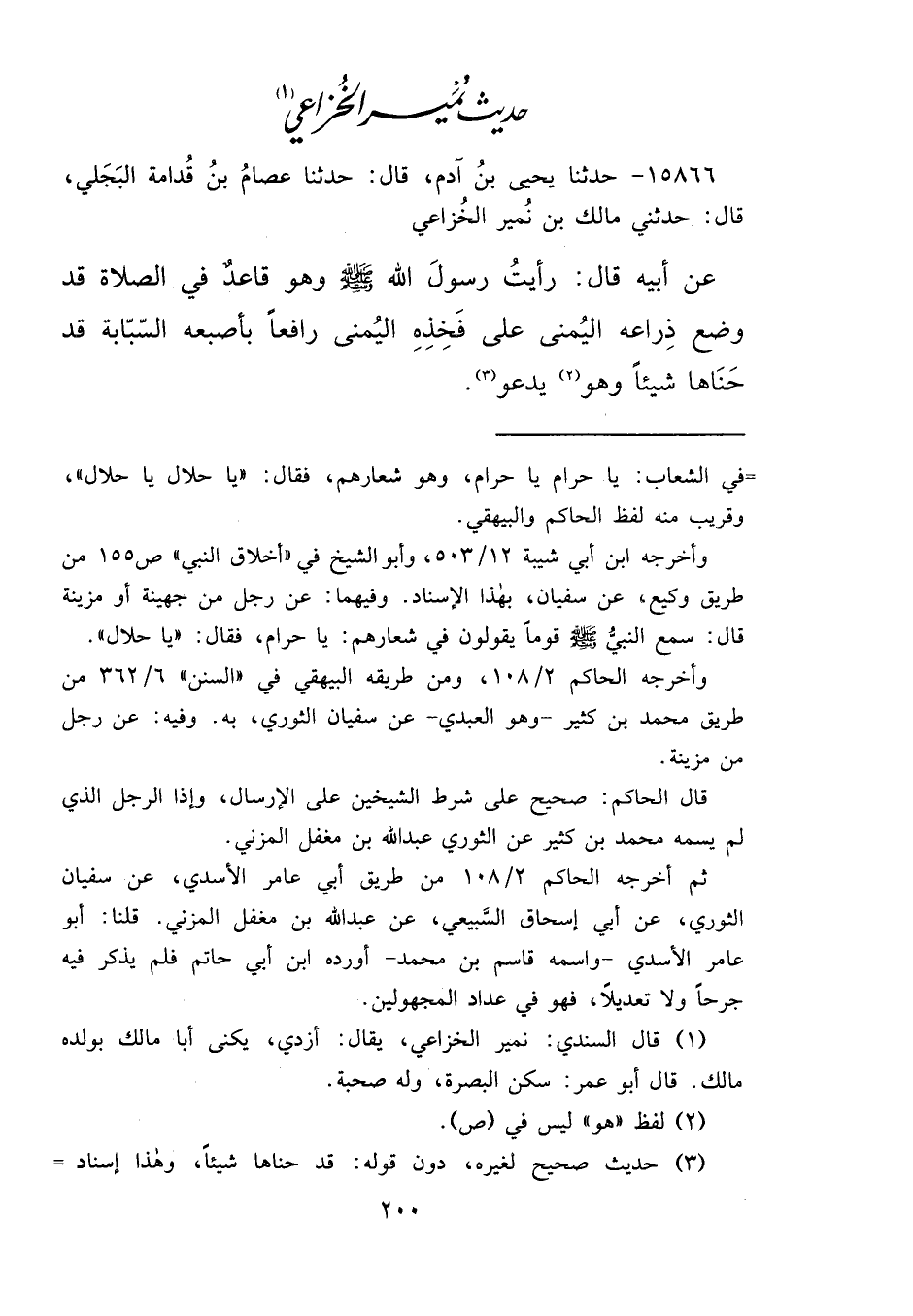 ١٥٨٦٦ - حَدَّثَنَا يَحْيَى بْنُ آدَمَ، قَالَ: حَدَّثَنَا عِصَامُ بْنُ قُدَامَةَ الْبَجَلِيُّ، قَالَ: حَدَّثَنِي مَالِكُ بْنُ نُمَيْرٍ الْخُزَاعِيُّ، عَنْ أَبِيهِ، قَالَ: " رَأَيْتُ رَسُولَ اللهِ صَلَّى اللهُ عَلَيْهِ وَسَلَّمَ وَهُوَ قَاعِدٌ فِي الصَّلَاةِ قَدْ وَضَعَ ذِرَاعَهُ الْيُمْنَى عَلَى فَخِذِهِ الْيُمْنَى، رَافِعًا بِأُصْبُعِهِ السَّبَّابَةِ، قَدْ حَنَاهَا شَيْئًا وَهُوَ (٢) يَدْعُو " (٣)
