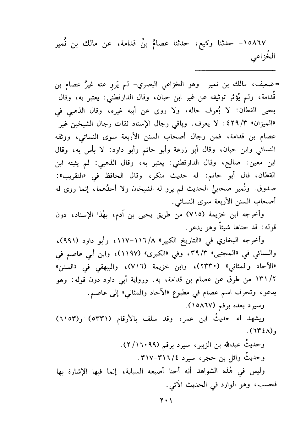 ١٥٨٦٧ - حَدَّثَنَا وَكِيعٌ، حَدَّثَنَا عِصَامُ بْنُ قُدَامَةَ، عَنْ مَالِكِ بْنِ نُمَيْرٍ الْخُزَاعِيِّ،