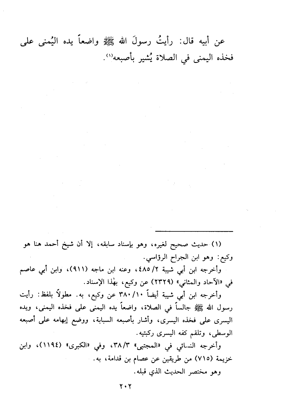 عَنْ أَبِيهِ، قَالَ: " رَأَيْتُ رَسُولَ اللهِ صَلَّى اللهُ عَلَيْهِ وَسَلَّمَ وَاضِعًا يَدَهُ الْيُمْنَى عَلَى فَخِذِهِ الْيُمْنَى فِي الصَّلَاةِ، يُشِيرُ بِأُصْبُعِهِ " (١)