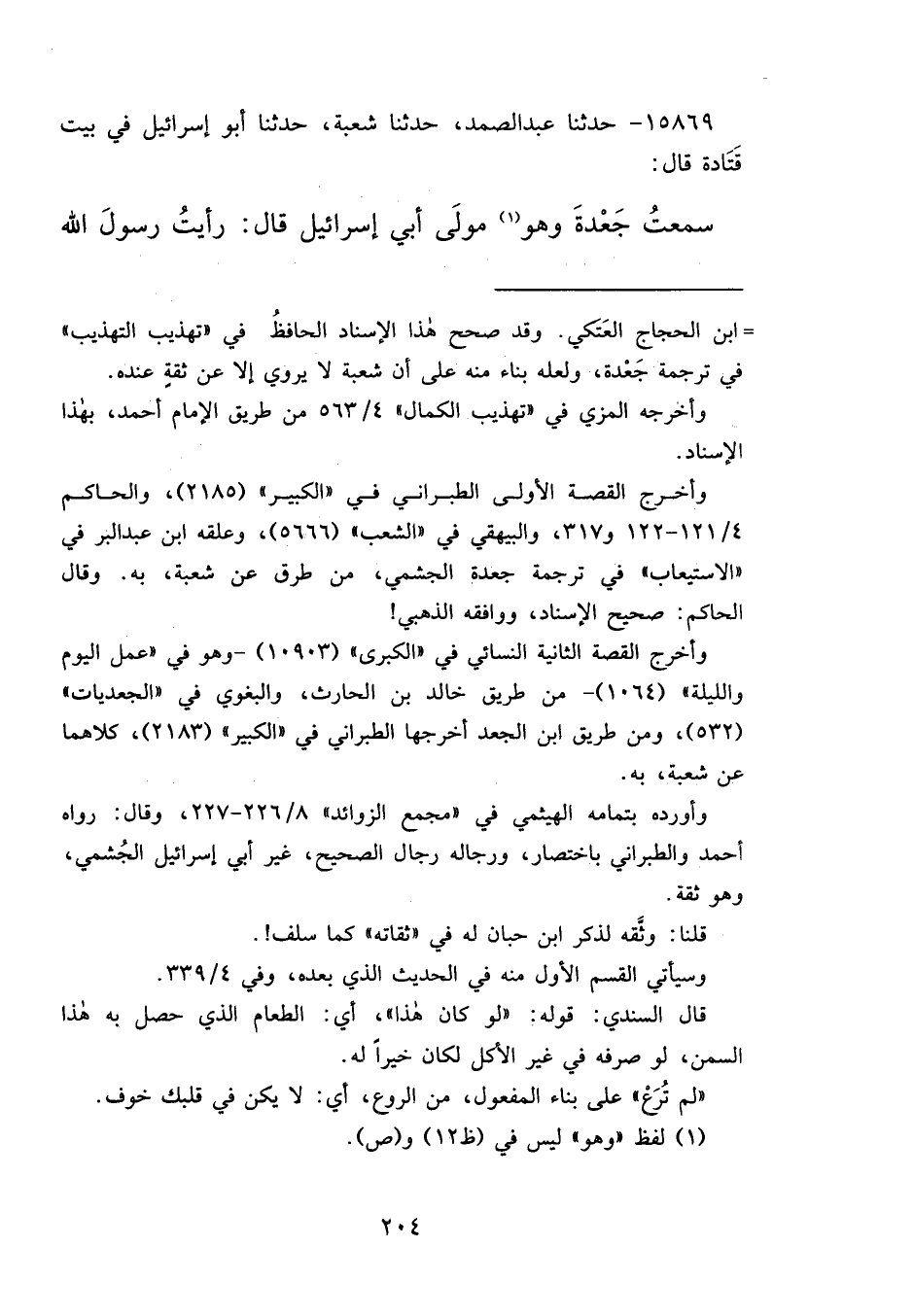 ١٥٨٦٩ - حَدَّثَنَا عَبْدُ الصَّمَدِ، حَدَّثَنَا شُعْبَةُ، حَدَّثَنَا أَبُو إِسْرَائِيلَ، فِي بَيْتِ قَتَادَةَ، قَالَ: سَمِعْتُ جَعْدَةَ، وَهُوَ (١) مَوْلَى أَبِي إِسْرَائِيلَ، قَالَ: رَأَيْتُ رَسُولَ اللهِ صَلَّى اللهُ عَلَيْهِ وَسَلَّمَ